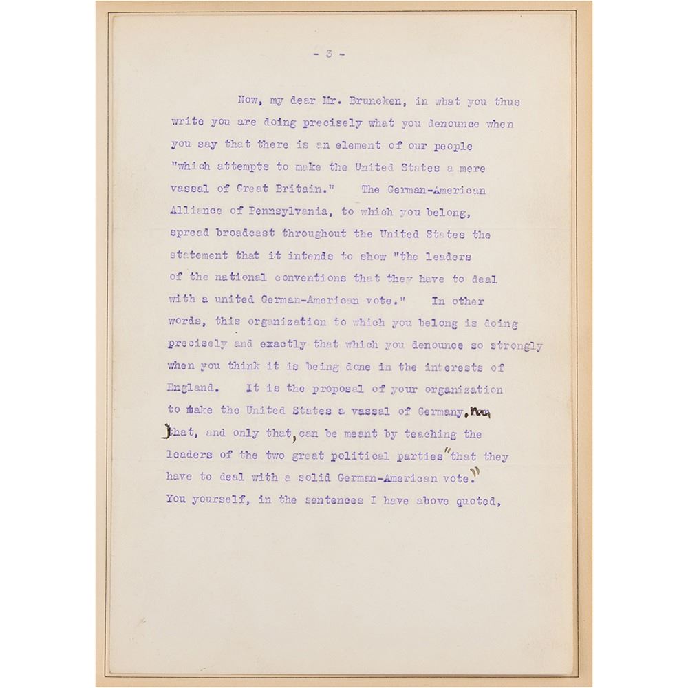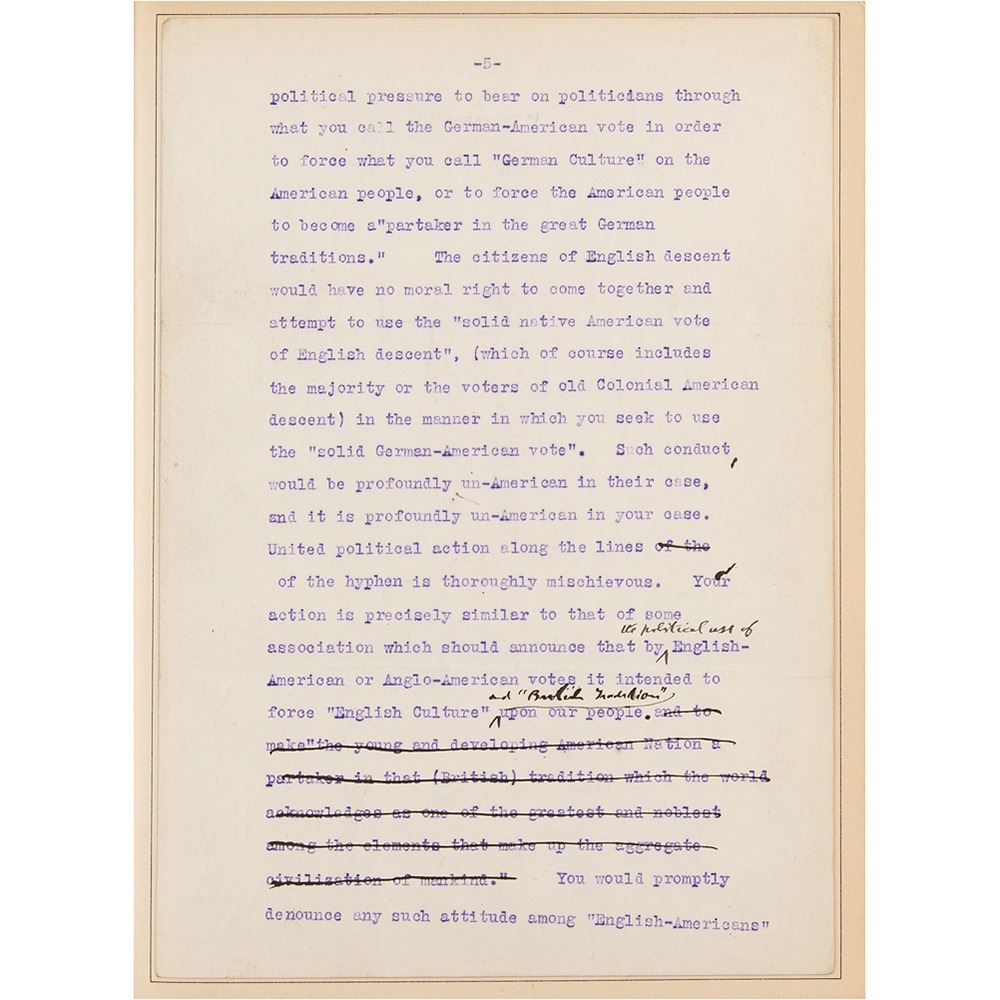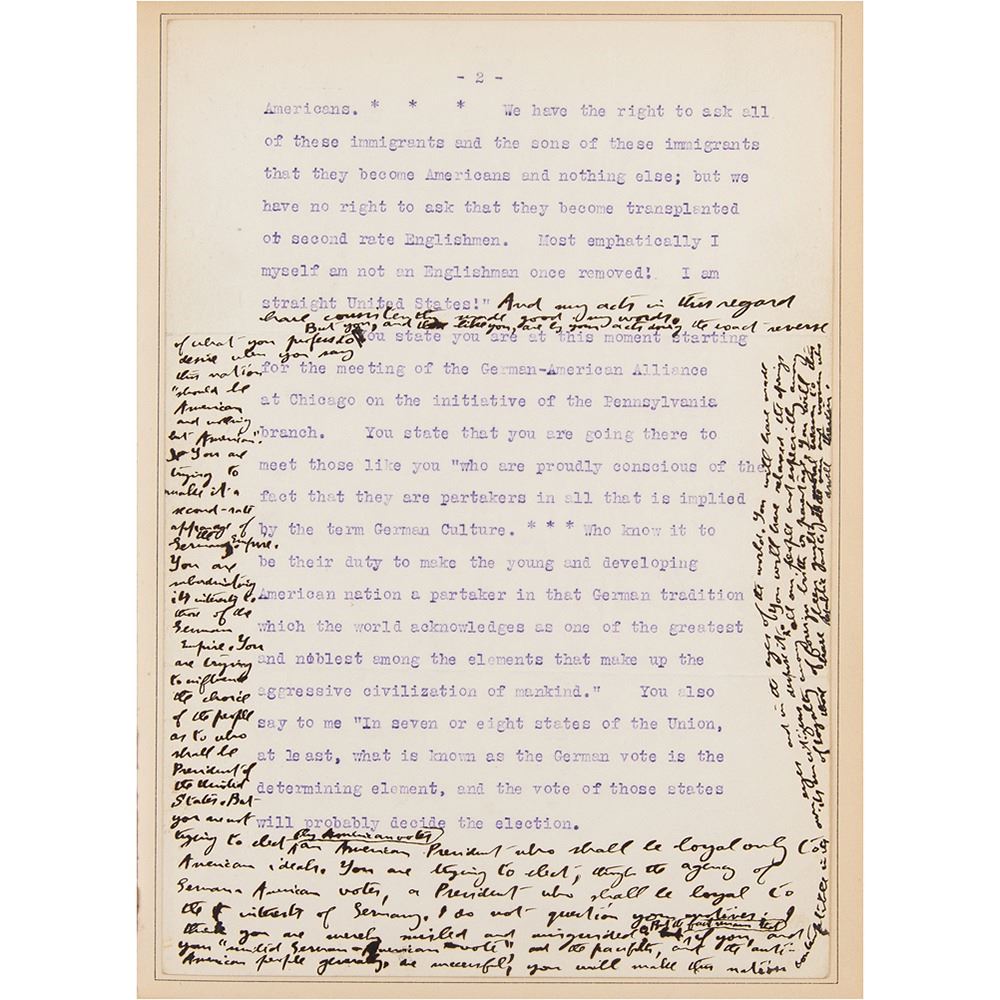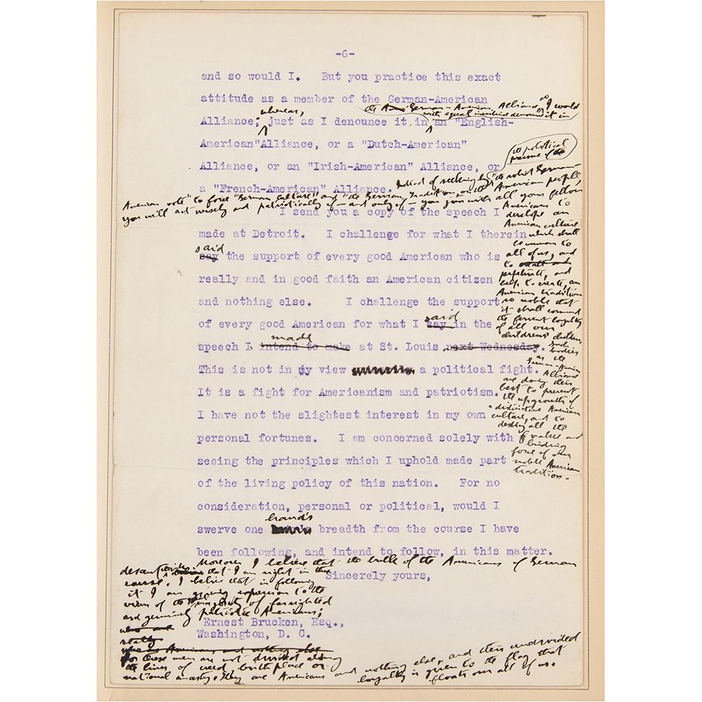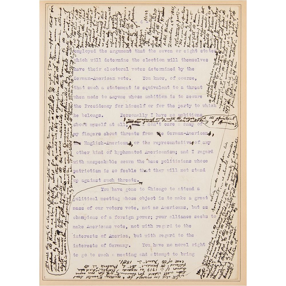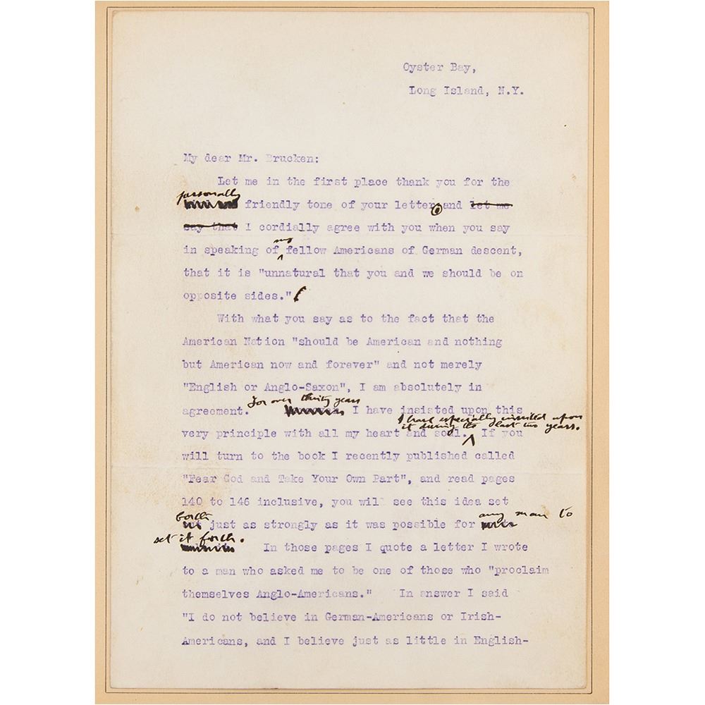 Extraordinary typed draft of a letter with extensive handwritten corrections by Theodore Roosevelt, totaling over 700 words in his hand, six pages, 7 x 10, no date but circa early 1916. Roosevelt writes on his concept of "Americanism" to Ernest Brucken of the German-American Alliance amidst World War I. He passionately outlines and defends his definition of American ideals, railing against "base politicians," "professional pacifists," and "sordid materialists." He also poignantly lashes out against the appearance of foreign influence in American politics, responding to Brucken's efforts to consolidate a block of pro-German voters in America.