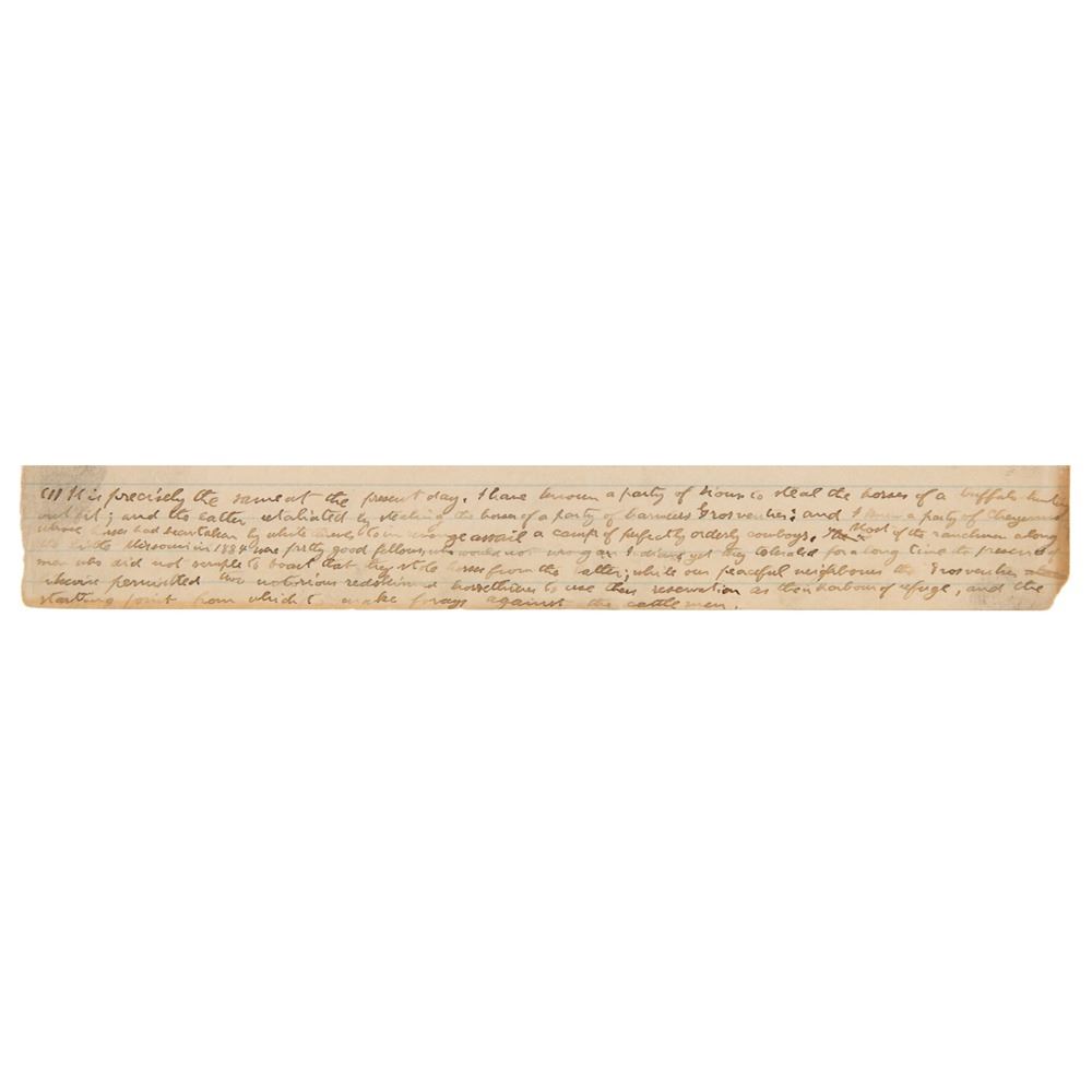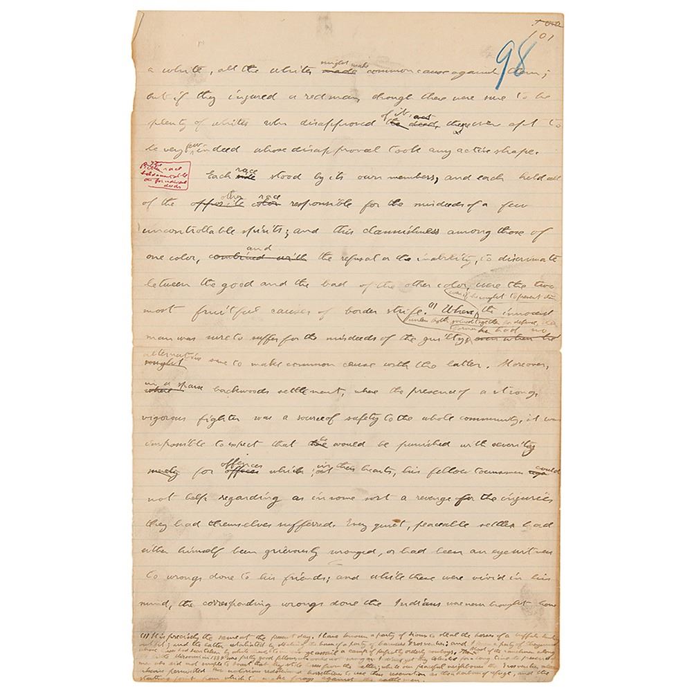 Handwritten manuscript by Theodore Roosevelt from his original draft for the four-volume The Winning of the West, one page, 8 x 12.5, no date but first published in 1889. This text, offering Roosevelt's observations on frontier justice amongst Native American Indian tribes, would be published as part of Volume I, Chapter IV: The Algonquins of the Northwest, 1769-1774. Roosevelt writes, in part: "Each race stood by its own members, and each held all of the other race responsible for the misdeeds of a few uncontrollable spirits; and this clannishness among those of one color, and the refusal or the inability to discriminate between the good and the bad of the other color were the two most fruitful causes of border strife. [Footnote: It is precisely the same at the present day. I have known a party of Sioux to steal the horses of a buffalo hunting outfit; and the latter retaliated by stealing the horses of a party of harmless Grosventres: and I knew a party of Cheyennes, whose horses had been taken by white thieves, to, in revenge, assail a camp of perfectly orderly cowboys. Most of the ranchmen along the Little Missouri in 1884 were pretty good fellows, who would not wrong Indians, yet they tolerated for a long time the presence of men who did not scruple to boast that they stole horses from the latter; while our peaceful neighbors, the Grosventres, likewise permitted two notorious redskinned horse thieves to use their reservation as a harbor of refuge, and the starting point from which to make forays against the cattlemen.]