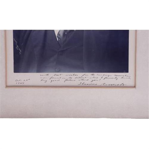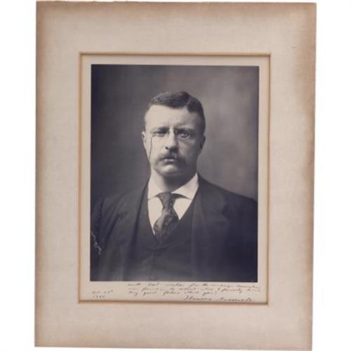 <B>Theodore Roosevelt Inscribed Signed Photograph</B></I> Impressive 11” x 15” black-and-white Pach Bros. portrait of 26th President Theodore Roosevelt, Jr. (1858-1919), mounted in 15.5” x 19.5” matte, signed during his presidency (1901-1908) on October 20, 1904. T.R. writes in full: “With best wishes for the campaign association now formed in the district where I formerly lived. May good fortune attend you! Theodore Roosevelt” The photograph is in fine condition; the matte is very good with minor wear and browning on the edges.<BR><BR><b>Shipping:</b> Flat Material, Large (<a target="_blank" href="http://www.heritageauctions.com/common/shipping.php">view shipping information</a>)
