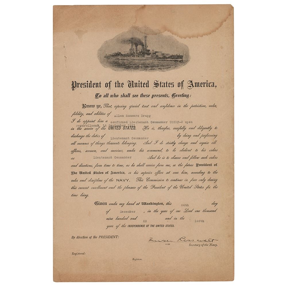 DS, signed “Theodore Roosevelt,” one page, 9.5 x 14.5, December 24, 1923. As Assistant Secretary of the Navy, Roosevelt appoints Allen Summers Bragg as a "confirmed Lieutenant Commander USNRF-3…in the service of the United States." Signed at the conclusion by Roosevelt. In very good to fine condition, with light creasing, a small edge chip, and staining and pin holes to the top.