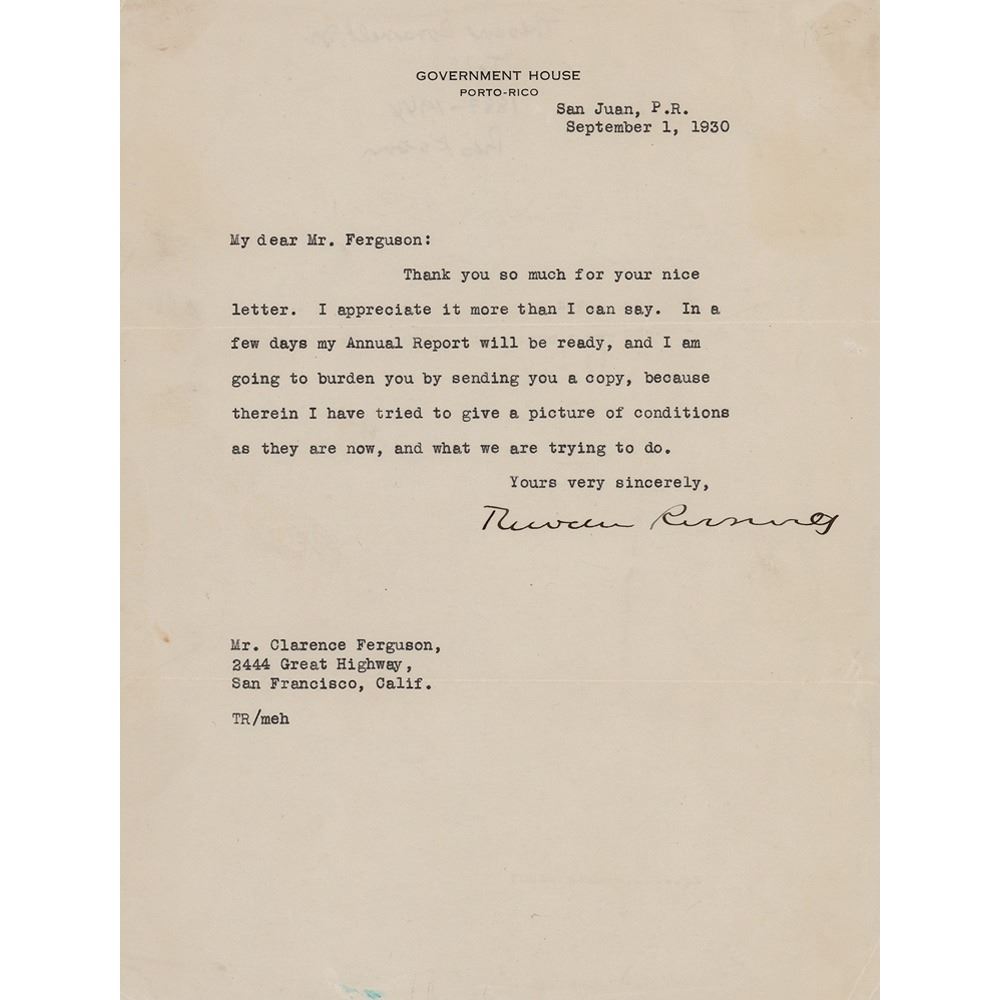 TLS signed “Theodore Roosevelt,” one page, 8 x 10.5, Government House, Porto-Rico letterhead, September 1, 1930. Letter to Clarence Ferguson, in part: “In a few days my Annual Report will be ready, and I am going to burden you by sending you a copy, because therein I have tried to give a picture of conditions as they are now, and what we are trying to do.” In fine condition. Accompanied by a limited edition cover honoring the Roosevelt and the 70th anniversary of D-Day.