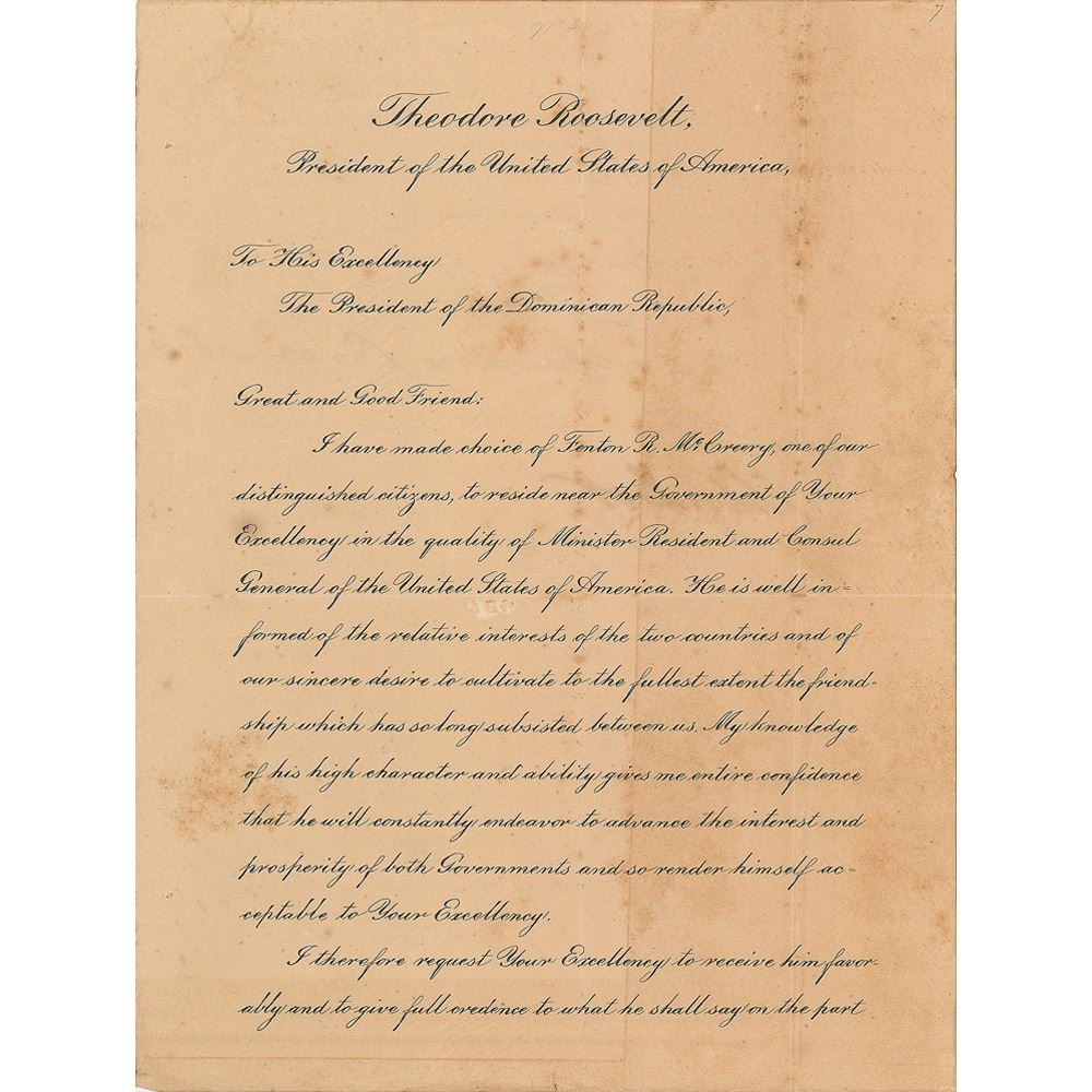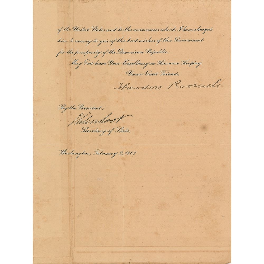 Manuscript letter of state signed as president, one page both sides, 10.5 x 14, February 2, 1907. Letter to the President of the Dominican Republic, in part: "I have made choice of Fenton R. McGreery, one of our distinguished citizens, to reside near the Government of Your Excellency in the quality of Minister Resident and Consul General of the United States of America…I therefore request Your Excellency to receive him favorably and to give full credence to what he shall say on the part of the United States and to the assurances which I have charged him to convey to you of the best wishes of this Government for the prosperity of the Dominican Republic." Prominently signed at the conclusion by Roosevelt, and countersigned by Secretary of State Elihu Root. In very good to fine condition, with foxing, toning, and intersecting folds; Roosevelt's signature is bold and uncommonly large.