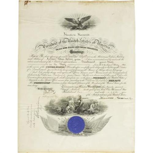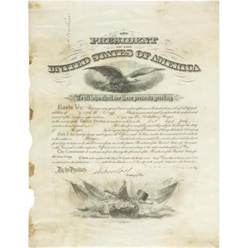 <B>Theodore Roosevelt Naval Commission Signed</B></I> "<I>Theodore Roosevelt</B></I>" as President and "<I>John D. Long</B></I>" as Secretary of the Navy, one page, 15.75" x 20.5". Washington, March 22, 1902. In part, "<I>Know Ye, that reposing special Trust and Confidence in the Patriotism, Valour, Fidelity, and Abilities of Arthur MacArthur junior I have nominated, and by and with the advice and consent of the Senate, do appoint him a Lieutenant Junior Grade in the Navy from the 6th day of May 1901 in the service of the United States...</B></I>" <B>Arthur MacArthur junior</B></I> (1876-1923), actually Arthur MacArthur III, had entered the U.S. Naval Academy at Annapolis when he was 16. Graduated with high honors in 1896, he was commissioned an ensign. MacArthur served aboard the gunboat USS <I>Vixen</B></I> in the Battle of Santiago on July 3, 1898 and participated in naval operations during the Philippine insurrection and Boxer Rebellion. He was commander of the first successful U.S. submarine, the USS <I>Holland</B></I>. According to his brother Douglas, he "was one of the original developers of underwater tactics and strategy." In 1911, Lieutenant Commander MacArthur was given command of a new destroyer, the USS <I>McCall</B></I>. Promoted to Commander, he was in command of the USS <I>San Francisco</B></I>, a mine sweeper, and in 1917, the armored cruiser USS <I>South Dakota</B></I> in the Pacific Fleet. When war was declared, MacArthur was transferred to the Atlantic Fleet and given command of the light cruiser USS <I>Chattanooga</B></I> which was on convoy duty. He was awarded the Navy Cross, the Distinguished Service Medal, and was promoted to Captain for his work in protecting the troop transports from German U-Boats. After the war, he headed back to sea on the USS <I>Henderson</B></I> which was on duty with the Navy Transportation Service. In 1923, Capt. MacArthur was stricken with appendicitis and died at the age of 47. In his memoirs, General Douglas MacArthur wrote, "I loved my brother dearly and his premature death left a gap in my life which has yet to be filled." There are stains at the upper edge and toning at the lower edge and two horizontal areas of light rippling, one of which passes through but does not affect the President's dark signature. Attractive naval vignettes at the top and bottom. Blue seal of the Navy Department is affixed at the lower center. Presidential commissions of famous naval officers rarely appear on the market. Fine condition.<BR><BR><b>Shipping:</b> Flat Material, Large (<a target="_blank" href="http://www.heritageauctions.com/common/shipping.php">view shipping information</a>)