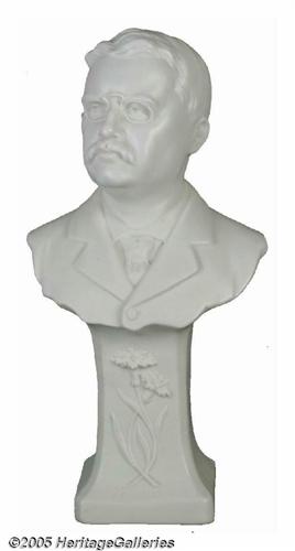 <B>Theodore Roosevelt Parisian Bust</B></I> This is the first Parisian bust of Theodore Roosevelt we have encountered. These types of busts first appeared in the mid-19th century and were popular until the early 20th century. This youthful TR may date to as early as the police commissioner of New York City and as late as when he took the oath of office for president in 1901. The bust stands 9" high. A wonderful addition to any TR collection. Lot:261