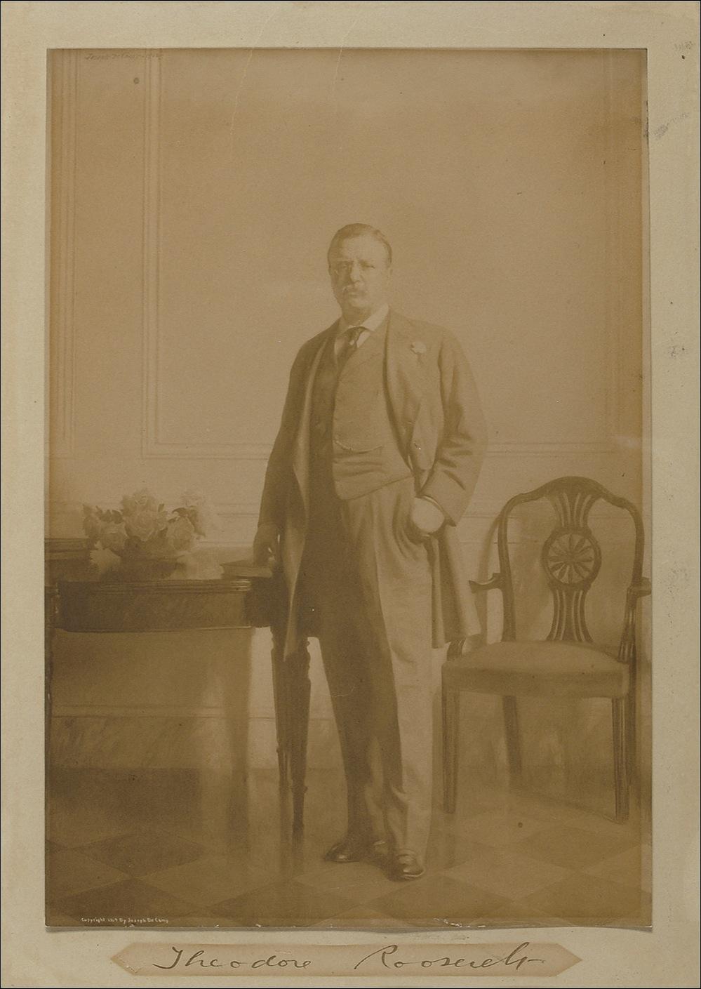 Theodore Roosevelt signed portrait. Joseph Decamp's 1908 full-length portrait of Roosevelt, signed in fountain pen, ''Theodore Roosevelt.'' Print to bottom edge reads, ''Copyright 1909 by Joseph DeCamp.'' Photo bears DeCamp's printed signature and date of 1908. 9'' x 13'' photo affixed to 10.5'' x 14'' mount, matted and framed to 19'' x 22.5''. Toning to signature, creases to top edge, some chips & light soiling. Very good condition.