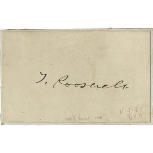 <B>Theodore Roosevelt Signature</B></I> "<I>T. Roosevelt</B></I>". 4" x 2.5", on autograph card, mounted to a stiff backing, some toning to card, mounting remnants on the verso, else a bright, bold signature in fine condition. <I>Ex. Henry E. Luhrs Collection</B></I>.<BR><BR><BR><b>Shipping:</b> Flat Material, Small (<a target="_blank" href="http://www.heritageauctions.com/common/shipping.php">view shipping information</a>)
