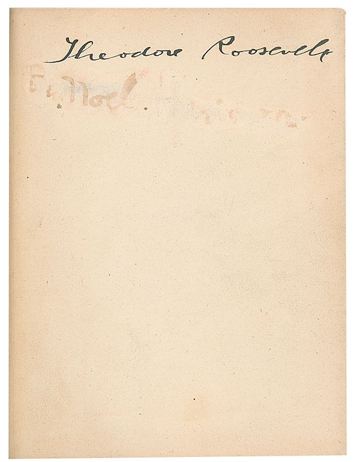 Signed book: Message of the President of the United States communicated to the Two Houses of Congress at the Beginning of the First Session of the Fifty-Seventh Congress, with Topical Analysis. First edition. NY: William Beverley Harrison, 1901. Hardcover bound in green cloth with black lettering, 4.75 x 6.25, 87 pages. Signed on the first free end page in bold ink, "Theodore Roosevelt." Autographic condition: very good, with a partially-removed old ownership signature beneath Roosevelt's. Book condition: VG/None, with partially-removed annotations to front board and a "Library of Lawrence E. Miller" blindstamp to the last page.