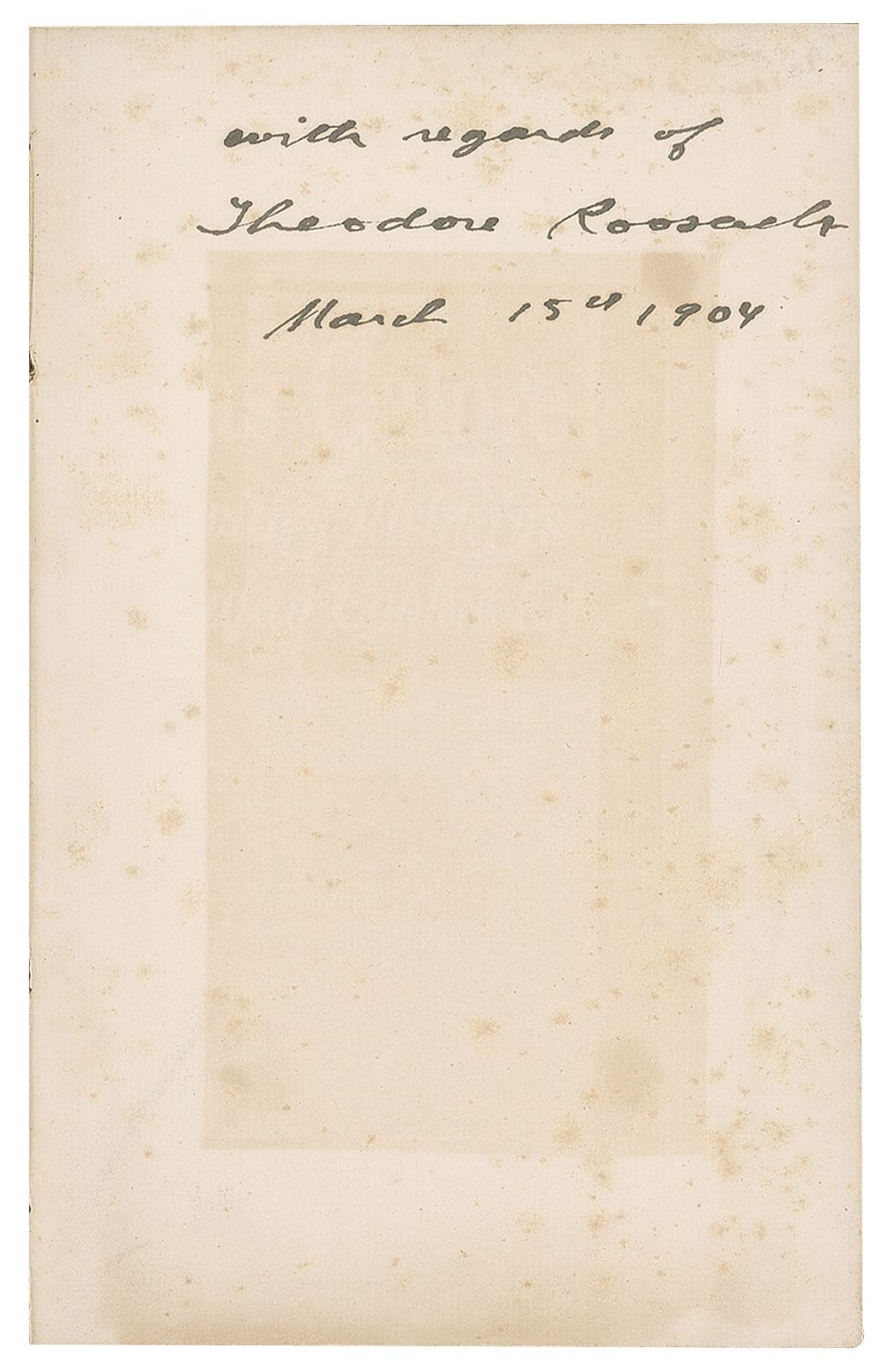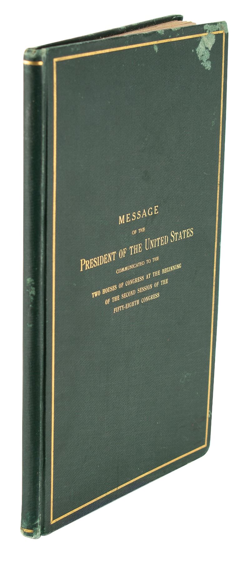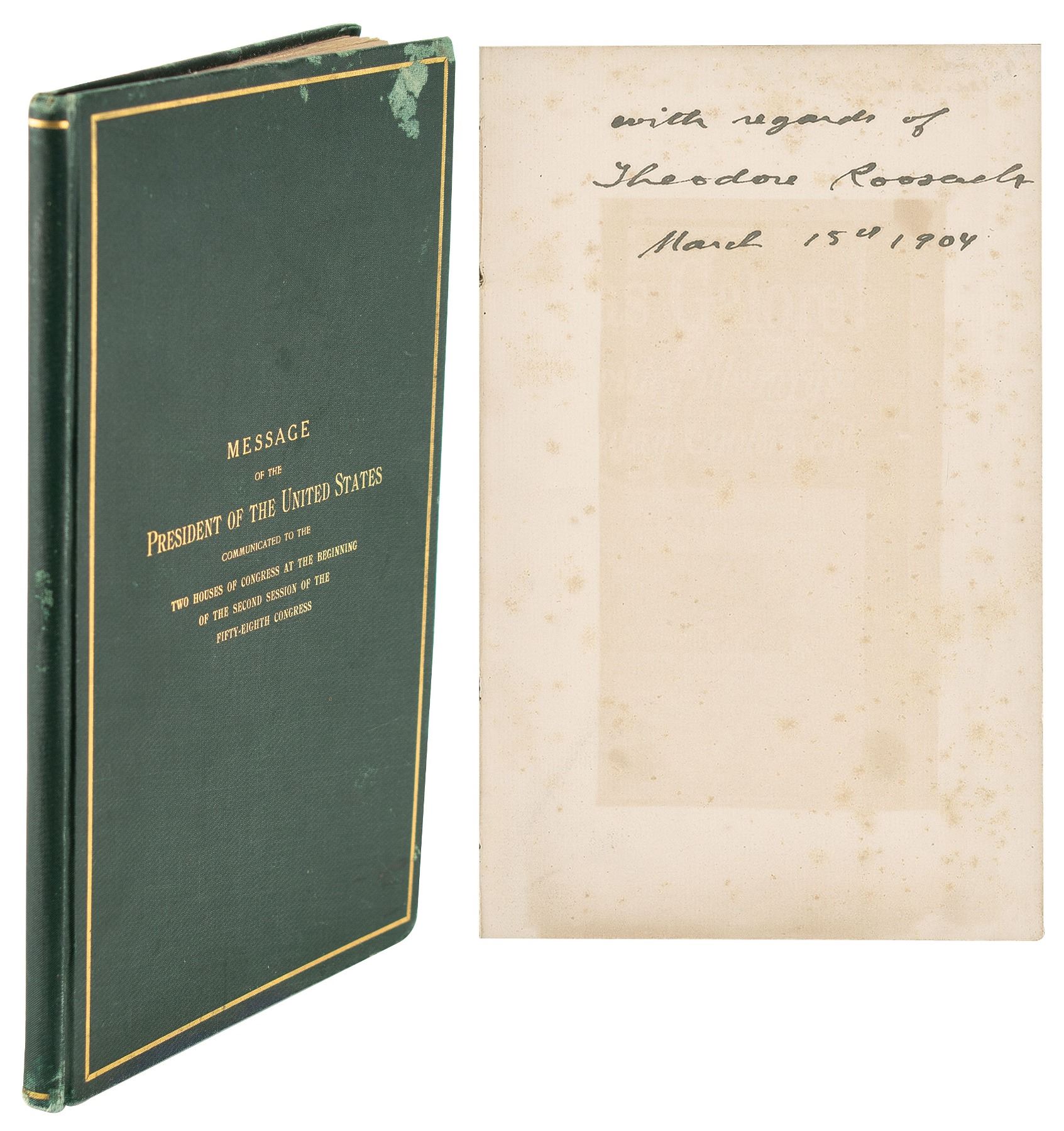 Signed book: Message of the President of the United States communicated to the Two Houses of Congress at the beginning of the Second Session of the Fifty-Eighth Congress. First edition. Washington: Government Printing Office, 1903. Hardcover bound in dark green cloth with gilt stamping, 6 x 9.5, 36 pages. Signed on the first free end page in ink, "with regards of Theodore Roosevelt, March 15th 1904." Autographic condition: very good to fine, with overall foxing, and a block of offset toning from a bookplate once affixed to the facing pastedown. Book condition: VG/None, with scuffing to spine and boards, moderate foxing to textblock, and a "Library of Lawrence E. Miller" blindstamp to a rear page.