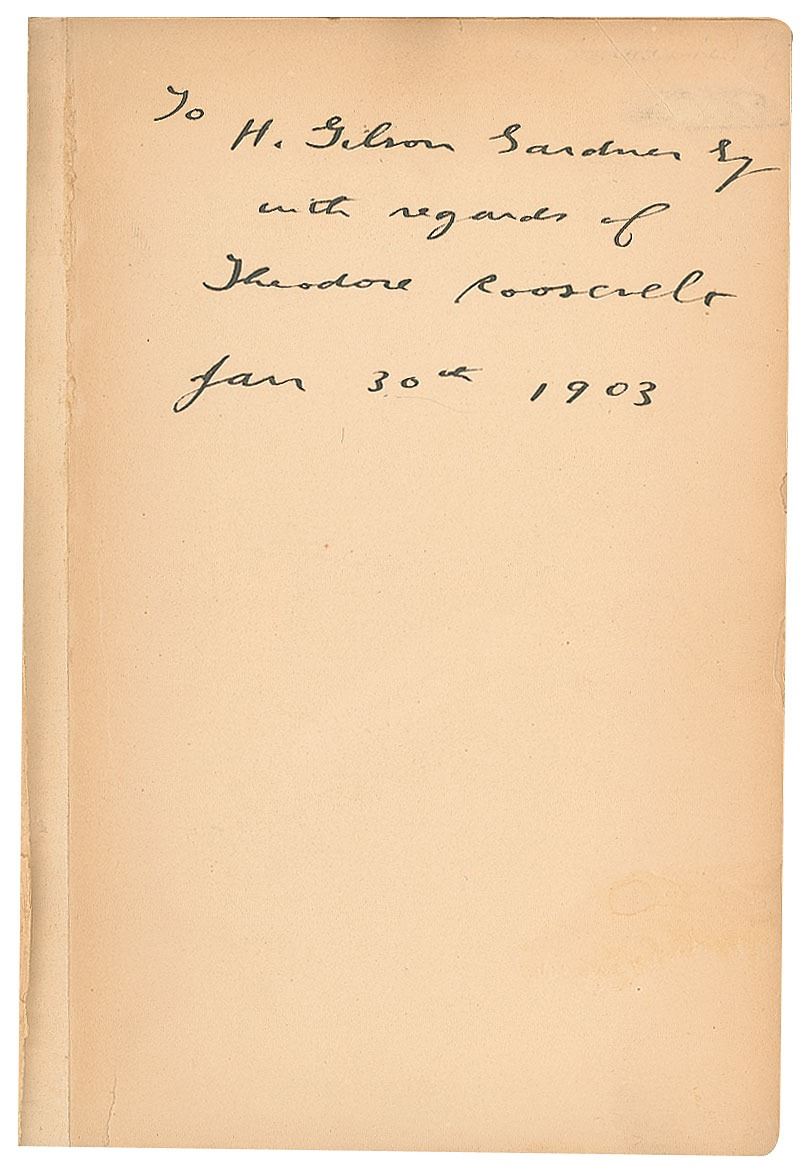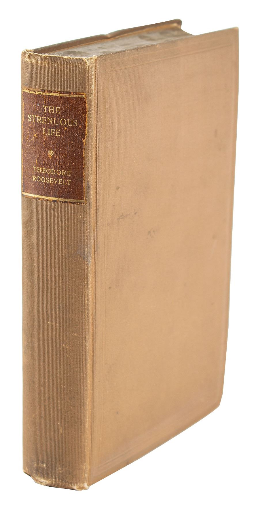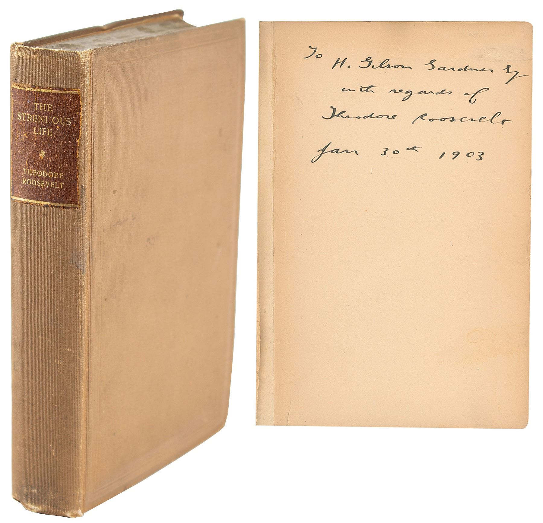 Signed book: The Strenuous Life: Essays and Addresses. First edition. NY: The Century Co., 1902. Hardcover bound in brown cloth with a morocco gilt spine label, 5.5 x 7.75, 1902 pages. Signed and inscribed on the first free end page in ink, "To H. Gilson Sanders, with the regards of Theodore Roosevelt, Jan. 30th 1903." Autographic condition: very good to fine, with tape reinforcement along the left edge of the signed page and the hinge, and an unobtrusive crease to the upper right corner reinforced with clear tape on the reverse. Book condition: VG/None, with edgewear, a chip to the title page, and a "Library of Lawrence E. Miller" blindstamp to the last page.