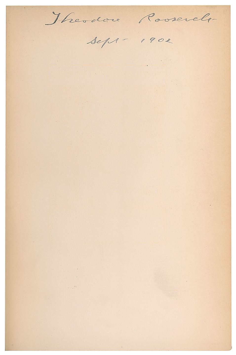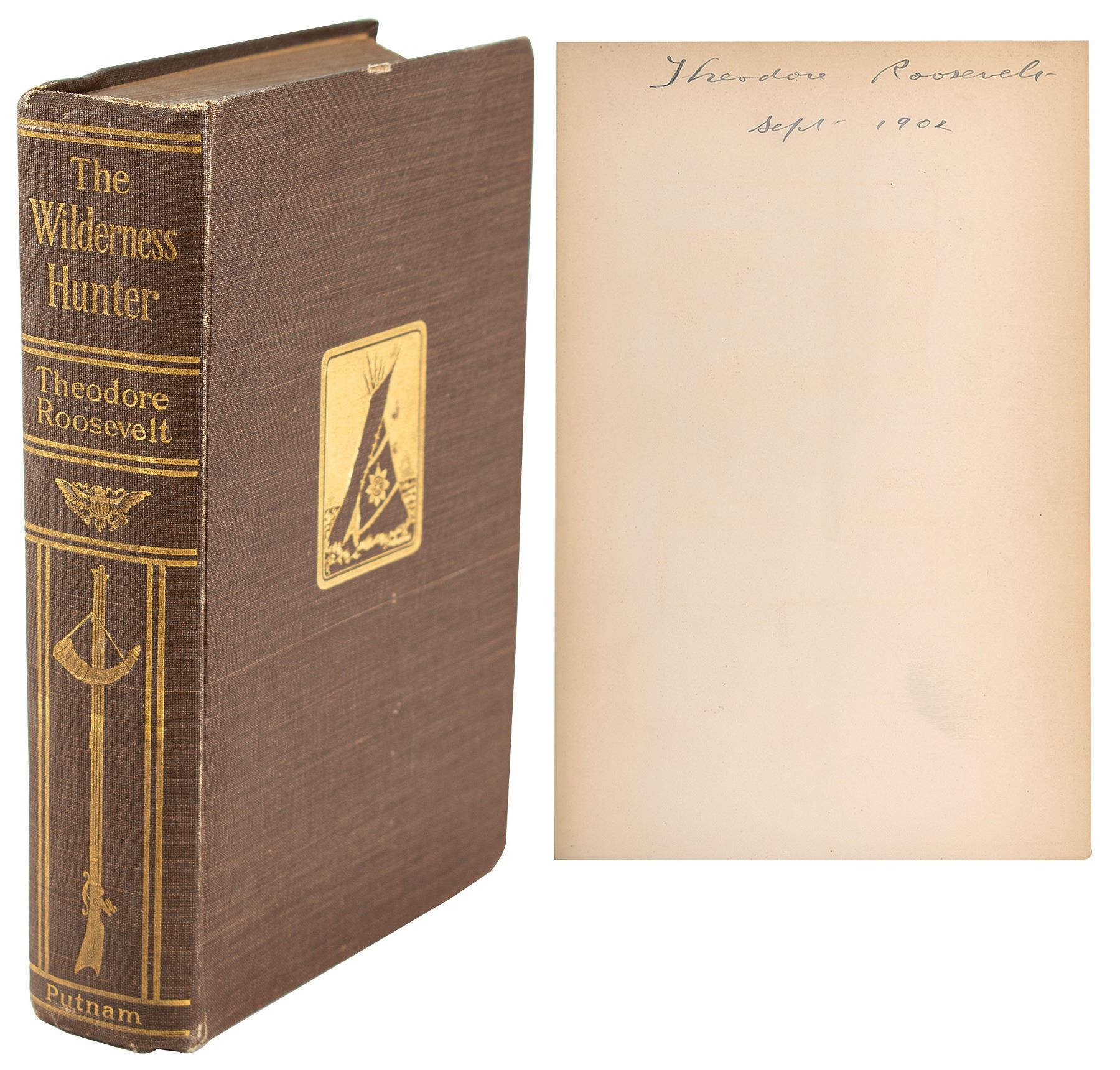 Signed book: The Wilderness Hunter. Special 'Alleghany Edition.' NY: G. P. Putnam's Sons/Knickerbocker Press, 1901. Hardcover bound in brown cloth with gilt stamping and design, 6.75 x 9.75, 472 pages. Nicely signed on the first free end page in ink, "Theodore Roosevelt, Sept. 1902." Autographic condition: fine. Book condition: VG/None, with rubbing to boards, bumped corners, wear at spine ends, and a "Library of Lawrence E. Miller" blindstamp to the last page.