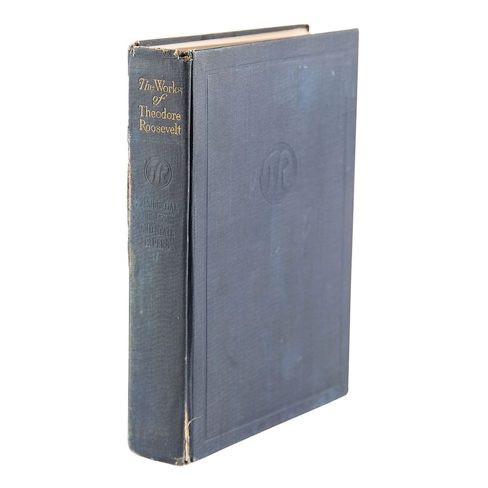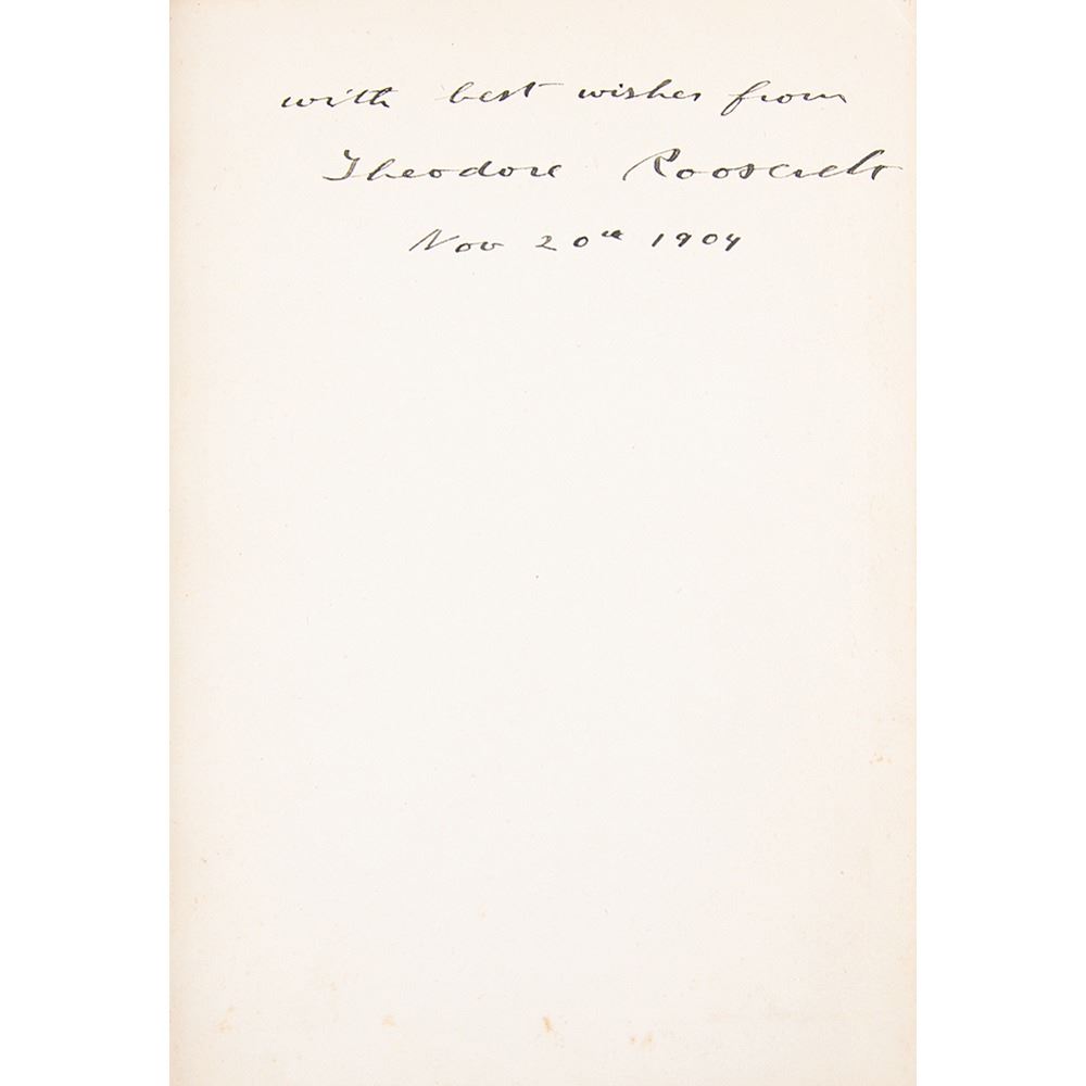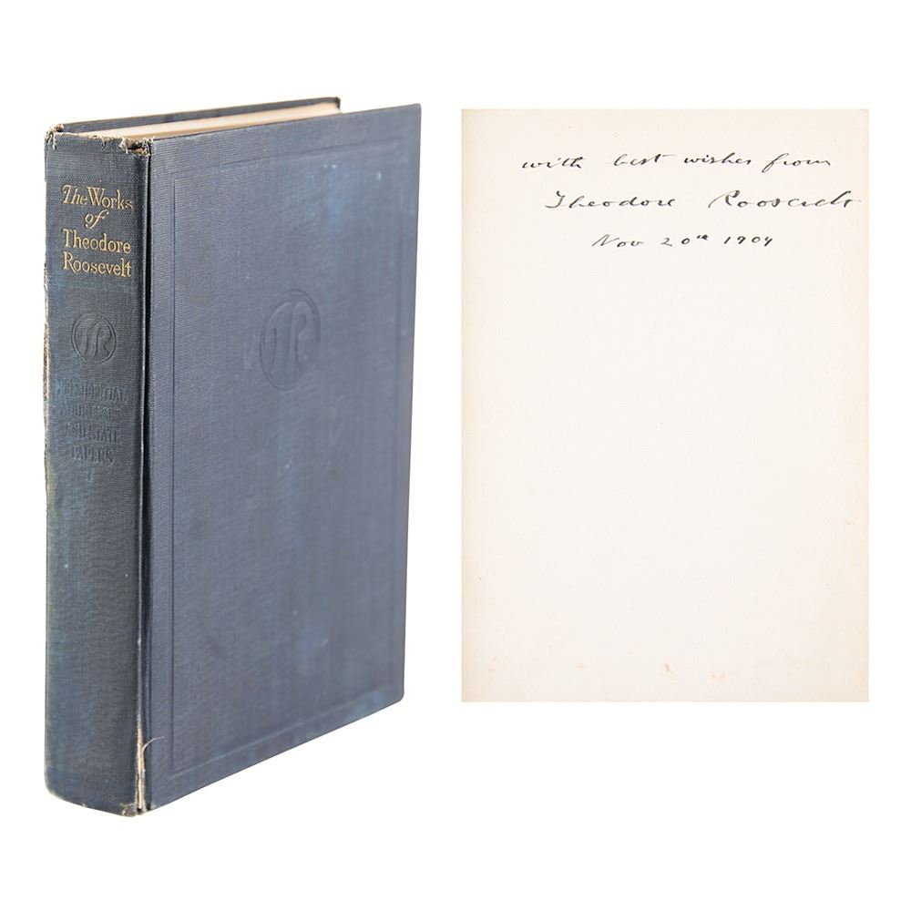 Signed book: The Works of Theodore Roosevelt, Vol. 13: Presidential Addresses and State Papers, Part One. Executive Edition. NY: P. F. Collier & Son. Hardcover, 5.75 x 8, 400 pages. Neatly signed on the first free end page in ink as president, "with best wishes from Theodore Roosevelt, Nov. 20th 1904." Autographic condition: fine. Book condition: VG-/None, with light wear at spine ends, cracked hinges and rear joint, and rubbing to boards.