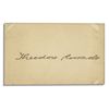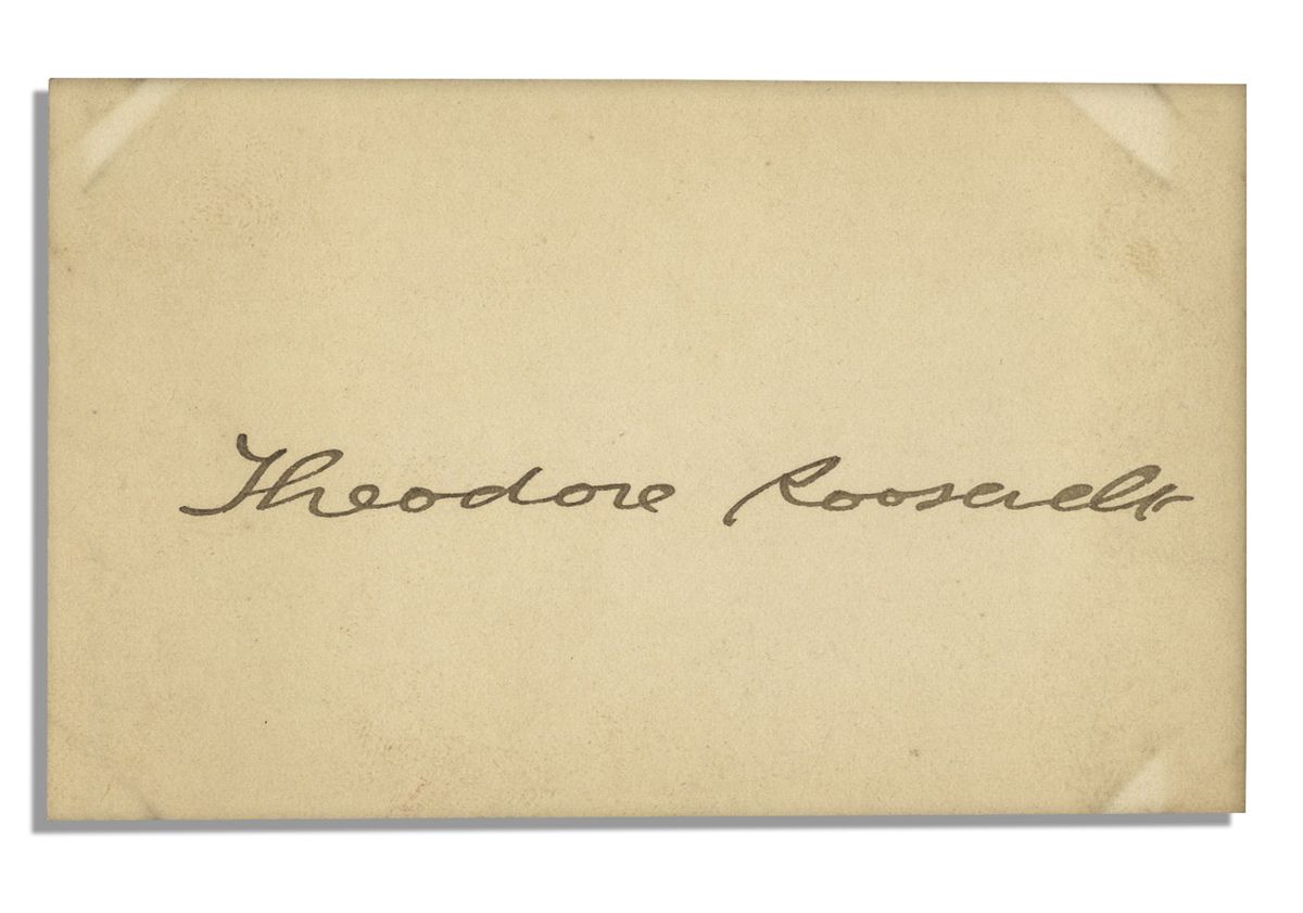Teddy Roosevelt signature. Signed, ''Theodore Roosevelt'' in ink across the center of the 4'' x 2.5'' card. Toning and adhesive remnants to verso, else near fine.