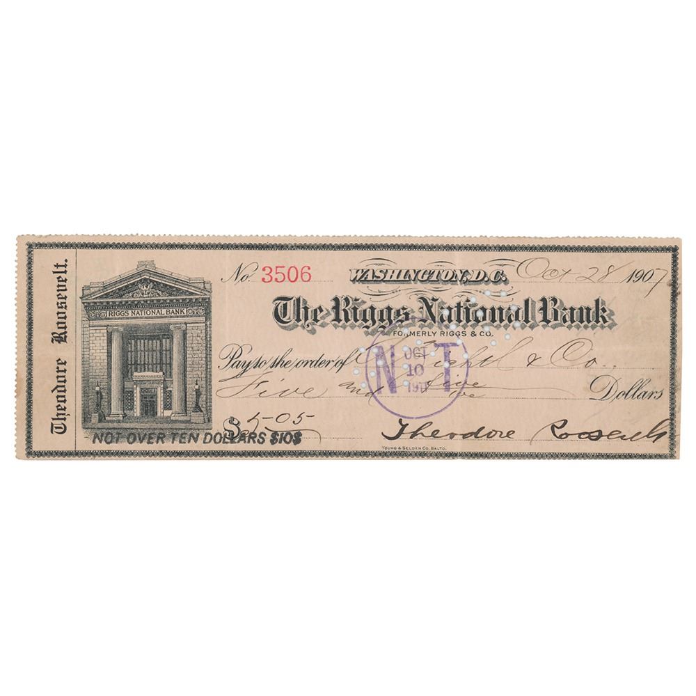 Personal check, 8 x 2.75, filled out in another hand and signed by Theodore Roosevelt as president, payable to A. Zichtt & Co. for $5.05, October 28, 1907. In fine condition. An attractive and boldly signed presidential check.