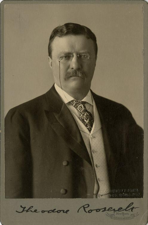 Superb Theodore Roosevelt cabinet photograph signed. 4” x 6” image depicts the handsome statesman wearing a three-piece suit. Signed boldly at the lower margin in black ink, “Theodore Roosevelt.” In very fine condition. A stunning piece.