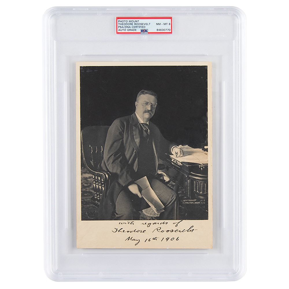 Exceptional matte-finish 6 x 7.5 portrait of Roosevelt in a seated profile pose by the Clinedinst Studio, affixed to the original 6.5. x9 studio mount, which is signed in fountain pen as president, "With regards of Theodore Roosevelt, May 16th 1906." In fine condition, with old adhesive residue on the back. Encapsulated and graded by PSA/DNA as "NM-MT 8."