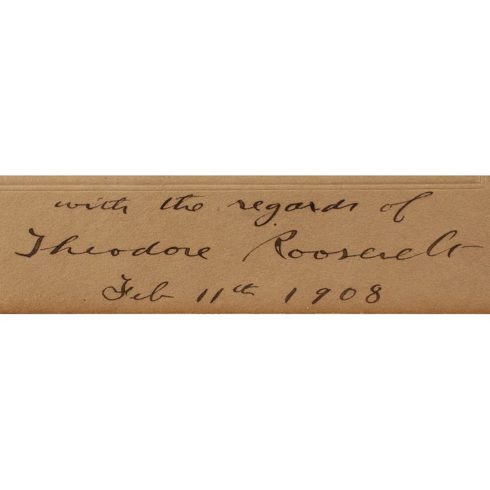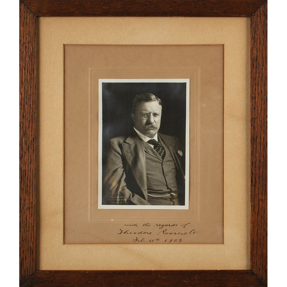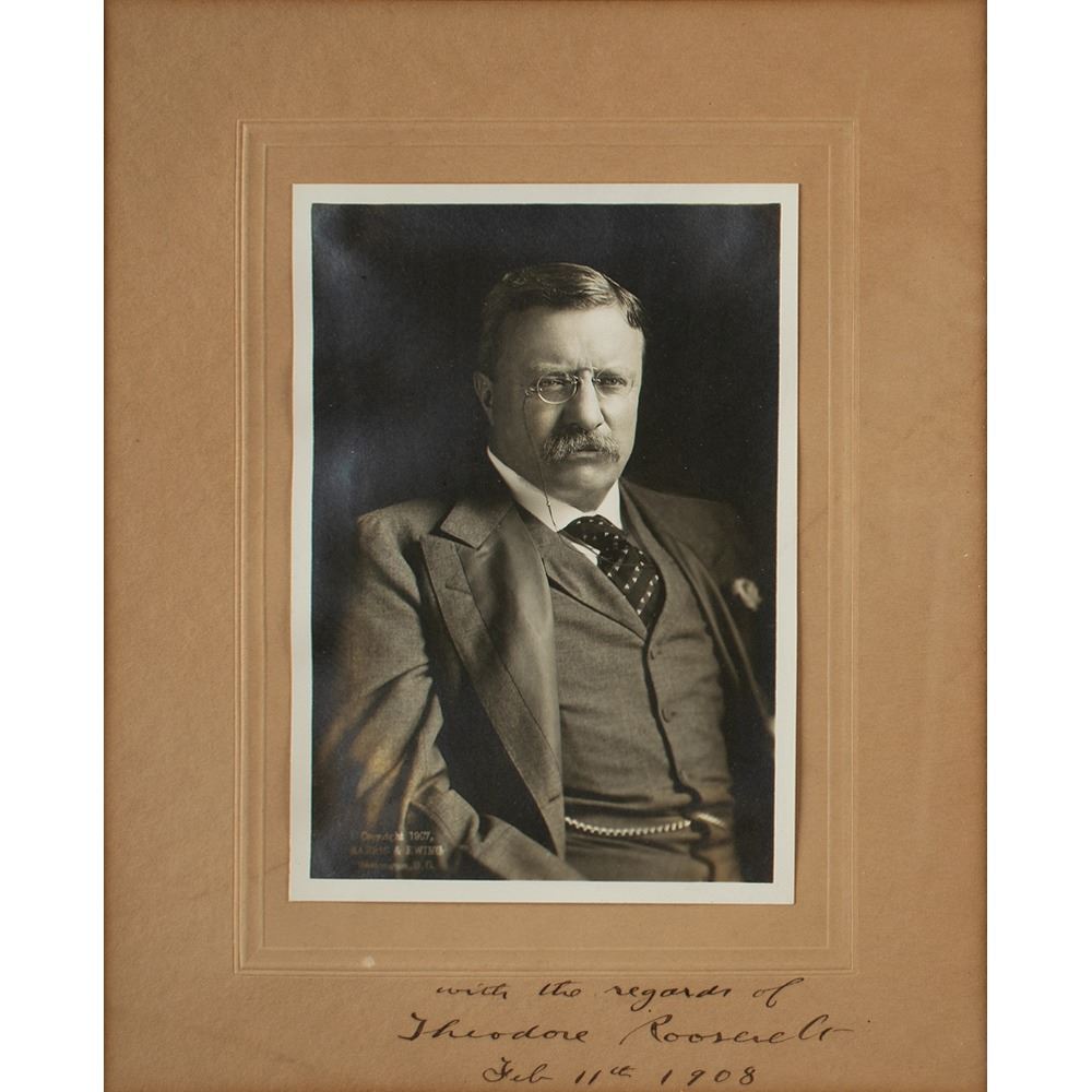 Exquisite vintage matte-finish 4.5 x 6.75 Harris & Ewing portrait of Roosevelt during his White House years, signed on the original studio mount in black ink as president, "with the regards of Theodore Roosevelt, Feb. 11th 1908." Matted and framed to an overall size of 12.75 x 14.75. In very good to fine condition, with dampstaining to the mat and mount, and silvering to the perimeter of the photo. The consignor notes that this portrait originates from the collection of Roger A. Selby, the son of shoe tycoon George D. Selby, who obtained the signature at the Dewey Hotel in Washington, D.C. Accompanied by Roger A. Selby's personal business card.