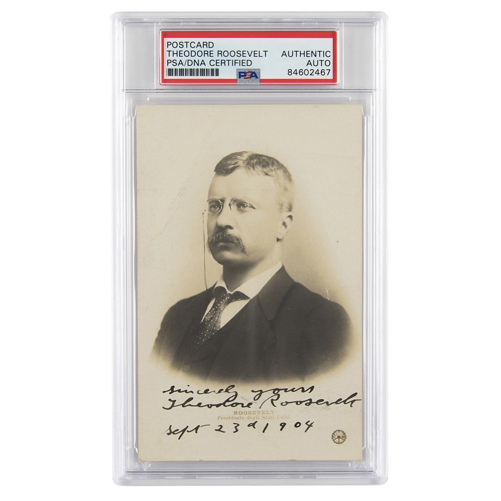 Scarce, splendid matte-finish 3.5 x 5.5 Italian postcard photo of Roosevelt from circa 1897, signed in bold fountain pen as president, “Sincerely yours, Theodore Roosevelt, Sept 23d 1904.†In fine condition, with a light diagonal bend to the upper left background area. Encapsulated in a PSA/DNA authentication holder. This portrait was originally taken by B. J. Falk in New York City, circa 1897, and depicts Roosevelt as the new Assistant Secretary of the Navy. A year later, at the onset of the Spanish–American War, he resigned and actively participated in combat as Lieutenant Colonel of the Army's First Volunteer Cavalry Regiment, a group soon to be forever known as the 'Rough Riders.'