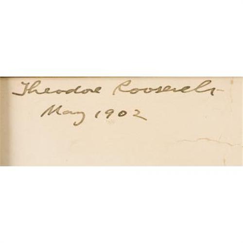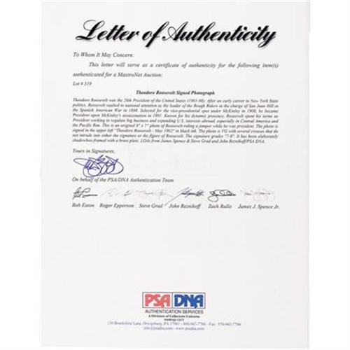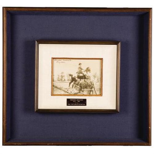 <B>Theodore Roosevelt Signed Photograph</B></I>. TR signed this 9” x 7” photograph during his years in the White House (1901-1908). The image brings to mind the Rough Rider of San Juan Hill as the President, on horseback, jumps a hedge on an equestrian course; signed <I>“Theodore Roosevelt / May 1902”</B></I>. The photo has been elaborately shadowbox-framed, with an attached nameplate, to a size of 27” x 25”. The photo is in very good condition with some minor creases that do not affect the signature or image of TR. <B>Comes with a COA from PSA/DNA</B></I>.<BR><BR><b>Shipping:</b> Framed - without Glass, Medium (<a target="_blank" href="http://www.heritageauctions.com/common/shipping.php">view shipping information</a>)