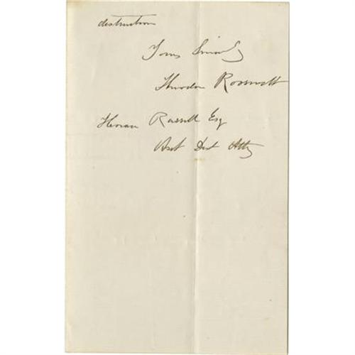 <B>Theodore Roosevelt, Sr. Autograph Letter Signed,</B></I> 4.5” x 7”, four pages with cojoined sheets penned on first and third pages, on embossed stationary bearing the Roosevelt crest, 1873 , New York . The letter is to Assistant District Attorney Horace Russell, thanking him for “<I>having saved a boy who was entirely innocent from probable destruction.</B></I>” Roosevelt was the father of President Theodore Roosevelt, Jr. Some toning, folds, and mounted, else very good. <I>From the collection of Henry E. Luhrs.</B></I><BR><BR><BR><b>Shipping:</b> Flat Material, Small (<a target="_blank" href="http://www.heritageauctions.com/common/shipping.php">view shipping information</a>)