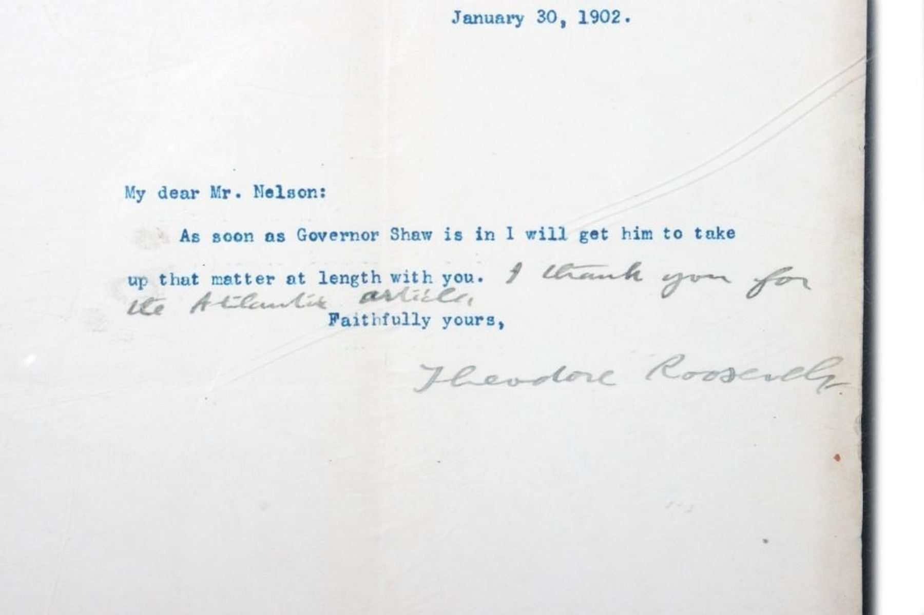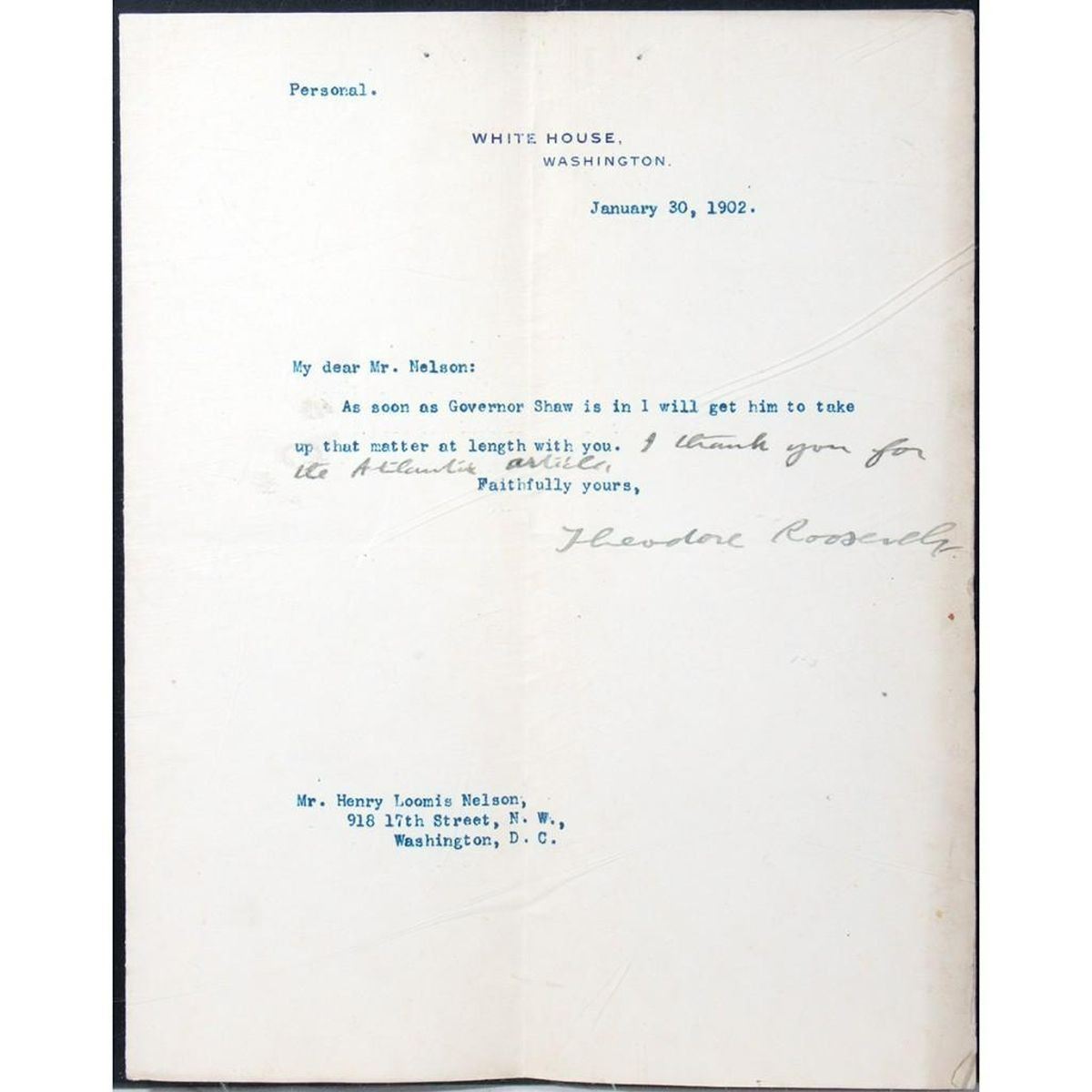 ROOSEVELT, THEODORE. 1919-1858. A typed letter signed on White House stationery, dated January 30, 1902. The letter is marked "Personal" and is addressed to Henry Loomis Nelson, an American author/journalist, in Washington D.C. The letter reads: "My Dear Mr. Nelson: As soon as Governor Shaw is in I will get him to take up that matter at length with you." The typed portion is followed by an addition in the President's hand, which reads: "I thank you for the Atlantic article." The full sheet measures 14 1/8" x 9", and has three vertical folds and a fold at the center. The letter portion measures 9" x 7".