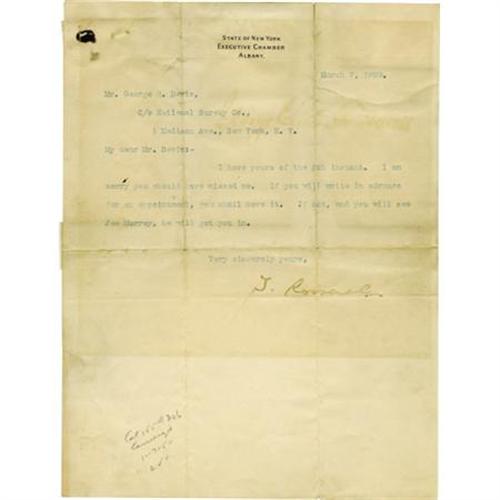 <B>Theodore Roosevelt Typed Letter Signed as Governor of New York</B></I> “<I>T. Roosevelt</B></I>”. One page, 8” x 10.5”, on State of New York Executive Chamber letterhead, Albany, March 7, 1899, to George H. Davis, New York. Governor Roosevelt apologizes to Davis for having missed a meeting with the latter and advises him that if he will “<I>write in advance for an appointment, you shall have it</B></I>”. The letter has toned with age and bears evidence of taped repairs on the verso. Roosevelt's signature is slightly faded, else good. <I>Ex. Henry E. Luhrs Collection.</B></I> <BR><BR><b>Shipping:</b> Flat Material, Small (<a target="_blank" href="http://www.heritageauctions.com/common/shipping.php">view shipping information</a>)