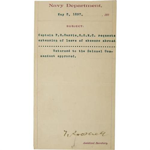 <B>Theodore Roosevelt Typed Document Signed as Assistant Secretary of the Navy</B></I> “<I>T. Roosevelt</B></I>”. 3.5” x 6.5”, on Navy Department letterhead, May 3, 1897, toned with old fold creases, one small streak under the “o” in Roosevelt, else near fine. Signed items from Roosevelt’s brief service as Assistant Secretary of the Navy are uncommon. He resigned his post at the start of the Spanish-American War in 1898 to organize the 1st U.S. Volunteer Cavalry. The document on offer is a request by Marine Captain F. H. Corrie to extend a leave of absence abroad. <BR><BR><BR><b>Shipping:</b> Flat Material, Small (<a target="_blank" href="http://www.heritageauctions.com/common/shipping.php">view shipping information</a>)