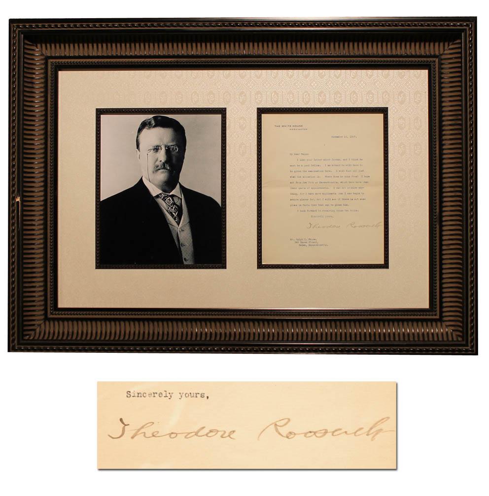 Theodore Roosevelt typed letter signed on official White House stationery, dated 15 November 1907. Here, Roosevelt responds to a recommendation that the author Ralph Paine makes regarding a political appointment, and reads in part, ''I like your letter about Jordan and I think he must be a good fellow…I can't promise anything…but I will see if there is not some place…Sincerely yours, Theodore Roosevelt''. Letter, measuring 7'' x 9'', is typed in green ink. Wood frame, measuring 27.5'' x 20'', has slight chip, otherwise near fine.