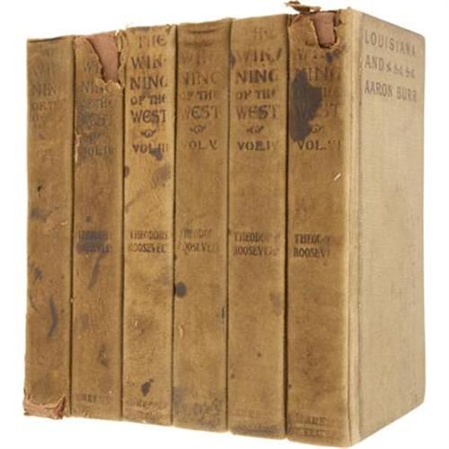 <B>Theodore Roosevelt: </B></I><B><I>The Winning of the West</B></I></B></I><B> in Six Volumes</B></I>. (New York: The Current Literature Publishing Company, 1905), six volumes, brown leather spines with cloth boards, 12mo (4.5” x 7”). Handsome set of Roosevelt’s treatment of America’s westward expansion. The volumes all display moderate wear to the spines and boards, and bumped corners. A few of the hinges on various volumes are tender. Volumes I, II and VI show noticeable chipping of the leather spine. Overall good condition, and a wonderful later printing of Roosevelt’s western saga.<BR><BR><b>Shipping:</b> Books & Catalogs (<a target="_blank" href="http://www.heritageauctions.com/common/shipping.php">view shipping information</a>)