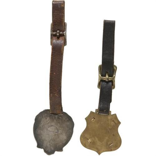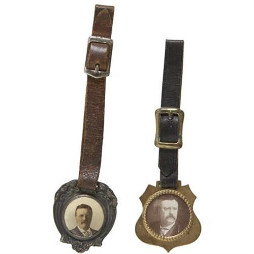 Theodore Roosevelt, Two Watchfobs One, made by Whitehead and Hoag, has a color picture of TR in a silvered Art Nouveau fob, suspended by a brown leather strap. The other fob has a sepia picture of TR on a gilt shield fob, suspended by a black leather strap. The longest is 5.5”. Both are near fine.<BR><BR><BR><B>Shipping:</B> Miscellaneous Collectibles, Smal (<a target="_blank" href="http://www.heritageauctions.com/common/shipping.php">view shipping information</a>)