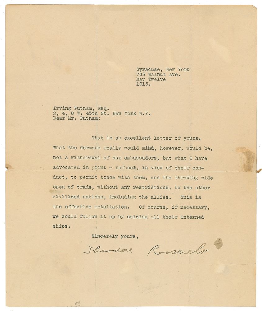 World War I-dated TLS, one page, 8.5 x 10.25, May 12, 1915. Letter to noted book publisher Irving Putnam, in full: "That is an excellent letter of yours. What the Germans really would mind, however, would be, not a withdrawal of our ambassadors, but what I have advocated in print--refusal, in view of their conduct, to permit trade with them, and the throwing wide open of trade, without any restrictions, to the other civilized nations, including the allies. This is the effective retaliation. Of course, if necessary, we could follow it up by seizing all their interned ships." In very good condition, with stains, three edge tears, and several areas of thin paper from prior mounting.