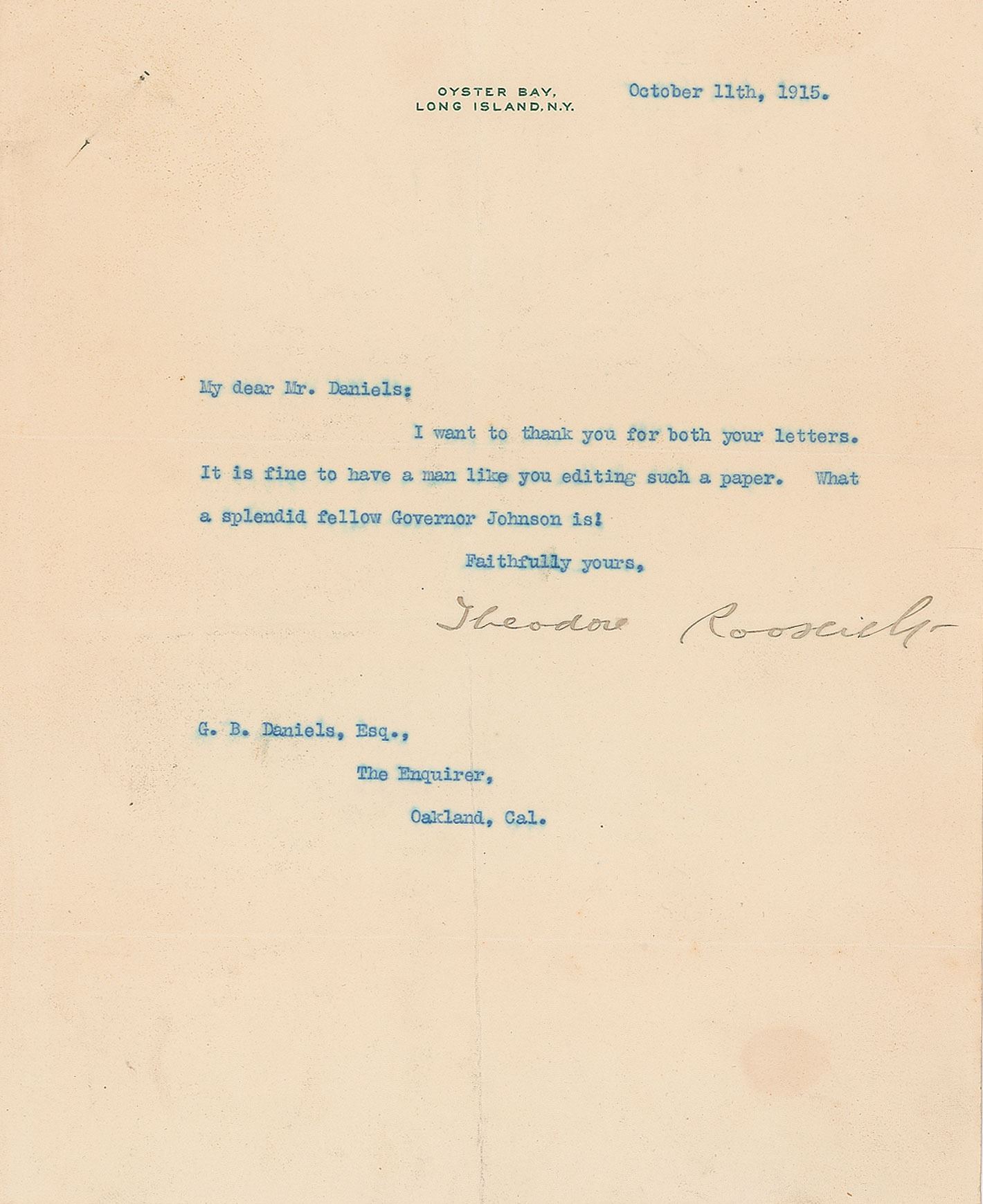 TLS, one page, 7.75 x 9.5, Oyster Bay letterhead, October 11, 1915. Letter to G. B. Daniels of the Oakland Enquirer, in full: "I want to thank you for both your letters. It is fine to have a man like you editing such a paper. What a splendid fellow Governor Johnson is!" In very good to fine condition, with intersecting folds, light creasing, a faint stain, and pin holes to the upper left corner. Accompanied by retained carbon copies of two of Daniels's replies.