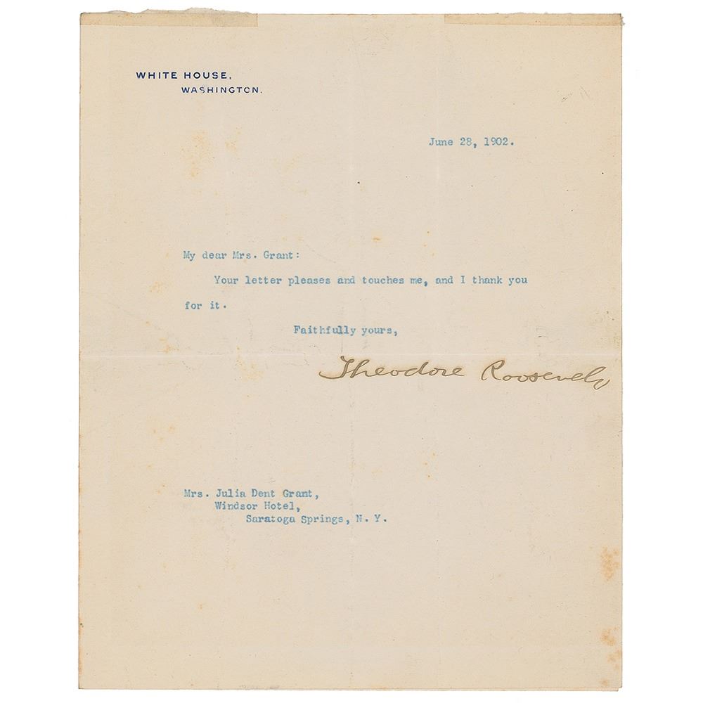TLS as president, one page, 7 x 9, White House letterhead, June 28, 1902. Letter to Julia Dent Grant, the widow of U. S. Grant. In full: "Your letter pleases and touches me, and I thank you for it." In very good condition, with overall creasing, several vertical folds, and old tape to the top edge.
