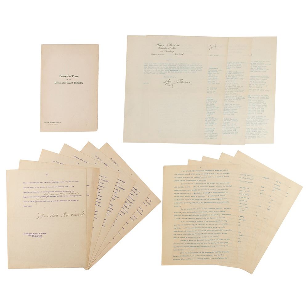 He goes on to enumerate his firsthand observations of the poor wages and conditions of young women immigrants working in textile factories: "The girls often support the whole family on their scanty sweatshop earnings. Some of the girls out of the miserable pittance paid them have themselves to pay for repairs to machines and for thread and needles…Now here were young girls, many of them undeveloped children, toiling excessive hours each day, often in dark unsanitary conditions, generally for low wages, diminished in many cases by charges for machines, electric power, for needles and even for drinking water. These girls are to be the future mothers of part of our American citizenship of the next generation. Aside even from the feeling of deep sympathy for them personally, which must be aroused in any man who investigates their conditions, there is the larger question of the social good of the whole race…We cannot as a community sit in apathy and permit these young girls to fight in the streets for a living wage and for hours and conditions of labor which shall not threaten their very lives. I very earnestly urge that a State Investigating Committee be appointed to inquire into the conditions of work in the wrapper, kimona and white goods trades." In fine condition, with light edge toning to the first page. Accompanied by Harry A. Gordon's five-page typed statement referred to by Roosevelt, a four-page TLS from Gordon to Schapp explaining his position, and a booklet entitled 'Protocol of Peace in the Dress and Waist Industry.'