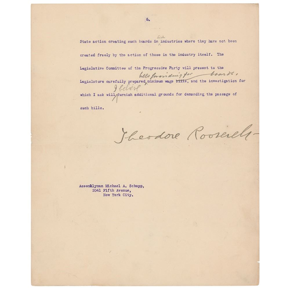 TLS, six pages, 8.5 x 10.5, January 24, 1913. Lengthy letter to Assemblyman Michael A. Schapp in New York City, commenting on labor unions and the right to organize, with several annotations by Roosevelt. In part: "It seems to me that in the interest of the people of New York it is now imperatively necessary that the Legislature of the State should undertake a thorough investigation into the labor conditions of the special industries severally designated as white goods, wrapper and kimona. In the dress and waist industry an investigation has already been arranged for within the industry itself by the joint action of the employers and the union. No such joint action has been arranged concerning the white goods, wrapper and kimona industry, and it cannot be arranged until the employers in those industries recognise the fundamental need that the employees shall have the right to combine into unions recognized by employers…I submit herewith a copy of a statement of Mr. Harry A. Gordon, the counsel of the employers in the white goods industry…I emphatically dissent from the position taken by Mr. Gordon…No man can inquire in the most cursory manner into the situation as it actually exists among these kimona and white goods workers without realizing that these young girls are absolutely helpless if they are obliged to bargain for their rights individually. They must possess the right of collective bargaining, and they must be able to establish for themselves relations with kindred organizations which will support them when they are wrongfully treated…Objection is often made that individual unions misbehave themselves. I have not the slightest question that this is the fact. It is well to bear in mind Abraham Lincoln's. homely phrase that 'There is a great deal of human nature in mankind.' There are, and will be, individuals and organizations that misbehave themselves among labor unions exactly as among employers' associations."