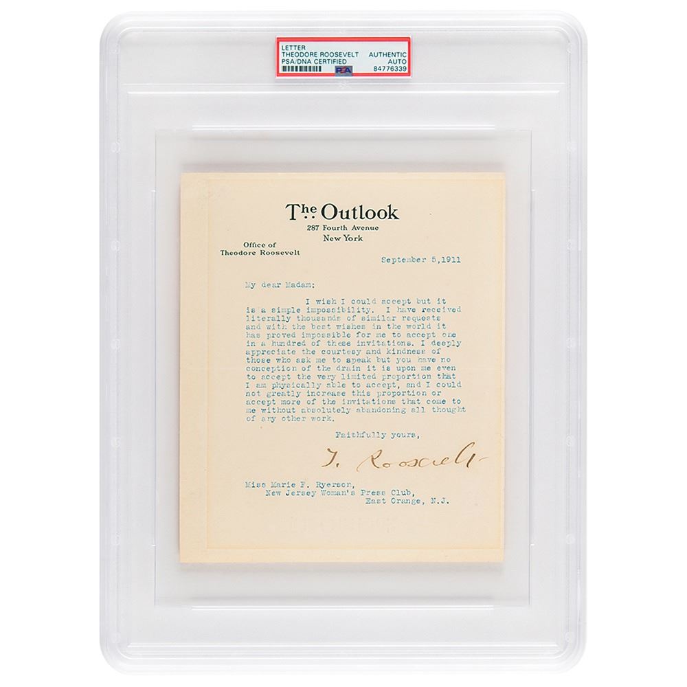 TLS signed & ldquo;T. Roosevelt,& rdquo; one page, 6.5 x 7.75, The Outlook letterhead, September 5, 1911. Letter to Marie F. Ryerson, in full: "I wish I could accept but it is a simple impossibility. I have received literally thousands of similar requests and with the best wishes in the world it has proved impossible for me to accept one in a hundred of these invitations. I deeply appreciate the courtesy and kindness of those who ask me to speak but you have no conception of the drain it is upon me even to accept the very limited proportion that I am physically able to accept, and I could not greatly increase this proportion or accept more of the invitations that come to me without absolutely abandoning all thought of any other work." In fine condition, with toning from prior display. Encapsulated in a PSA/DNA authentication holder.
