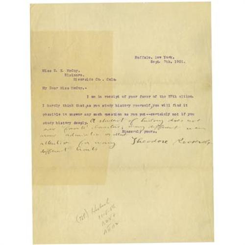 <B>Theodore Roosevelt Typed Letter Signed with a Holographic Postscript,</B></I> one page, 8" x 11", Buffalo, New York, September 7, 1901, to Miss E.E. McCoy, Elsinore, California. Writing as Vice-President, Roosevelt states in type, "<I>I am in receipt of your favor of the 27th ultimo. I hardly think that as you study history yourself you will find it possible to answer any such question as you put-certainly not if you study history deeply.</B></I>" As an after-thought, he adds in manuscript, "<I>A student of history does not have 'favorite' characters; many different men arouse admiration or attract attention for many different traits.</B></I>" Brown toning with an area of acid transfer from an old catalog description accompanying the letter. Very good condition. <I>From the collection of Henry E. Luhrs.</B></I><BR><BR><b>Shipping:</b> Flat Material, Small (<a target="_blank" href="http://www.heritageauctions.com/common/shipping.php">view shipping information</a>)