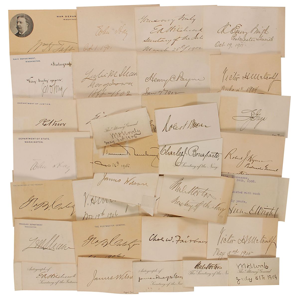 White House card, 4 x 2.75, signed in black ink, “Theodore Roosevelt.” In very good condition, scattered toning and soiling, moderate rippling, and mounting remnants to reverse. Accompanied by 36 slips and cards, each signed by a member of his cabinet. Signers are: William H. Taft (2), Elihu Root (2), John M. Hay (2), Lyman J. Gage, Leslie M. Shaw (2), Philander C. Knox, James Wilson (2), William H. Moody (2), George B. Cortelyou (2), Charles W. Fairbanks, Victor H. Metcalf (3), Paul Morton (2), Charles J. Bonaparte (2), Luke E. Wright, James Rudolph Garfield, Oscar S. Straus, George von L. Meyer, Robert J. Wynne, Ethan A. Hitchcock (2), Charles E. Smith, John D. Long, Truman H. Newberry, Robert Bacon, and Henry C. Payne. Scattered toning, soiling, and rippling, otherwise overall fine condition.