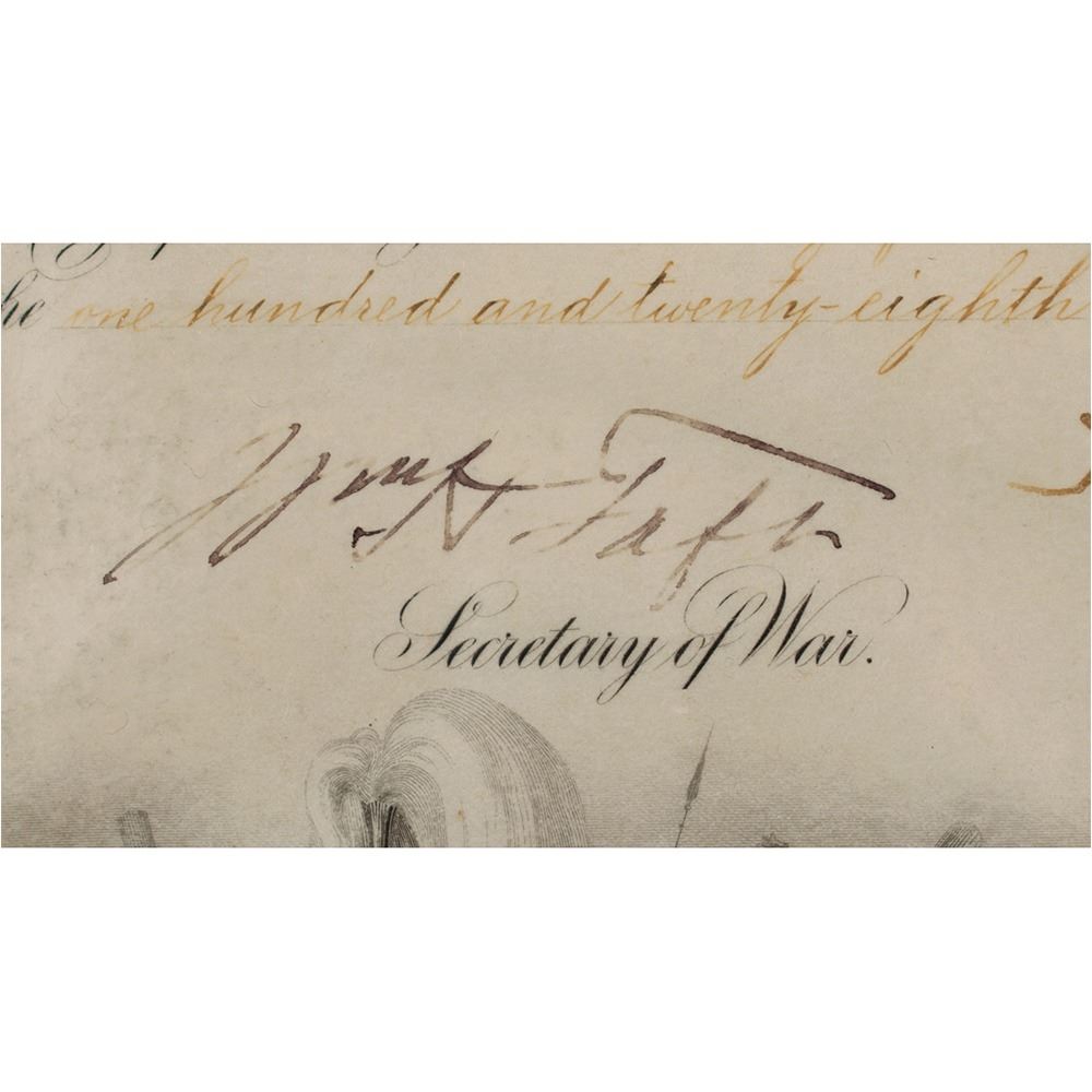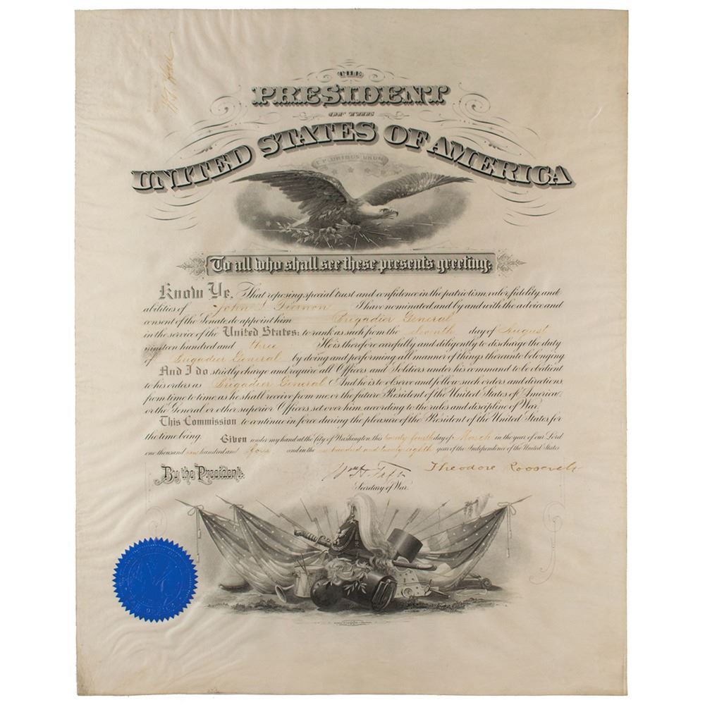 Partly-printed vellum DS, signed “Theodore Roosevelt†as president and “Wm. H. Taft†as secretary of war, one page, 15.5 x 19.5, March 24, 1904. President Roosevelt appoints John L. Tiernan as "Brigadier General in the service of the United States." Signed at the conclusion by President Roosevelt and countersigned by Secretary of War Taft. The blue seal affixed to the lower left remains intact. In fine condition, with slight skipping to Taft's signature.