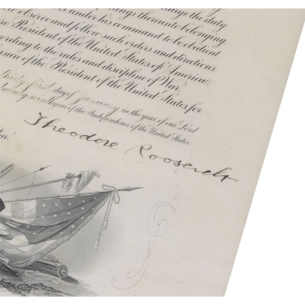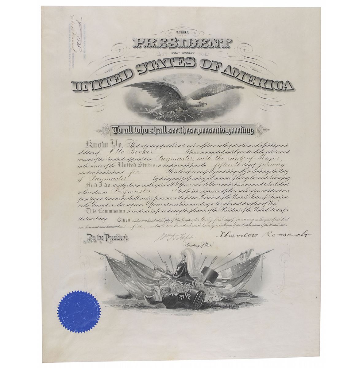 Choice partly-printed vellum DS, signed “Theodore Roosevelt” as president and “Wm. H. Taft” as secretary of war, one page, 15.75 x 20, January 31, 1905. President Roosevelt appoints Otto Becker as “Paymaster, with the rank of Major.” Boldly signed at the conclusion by President Roosevelt and countersigned by Secretary of War Taft. The blue seal affixed to the lower left remains fully intact. In fine condition. A positively gorgeous, bright document boasting bold, crisp signatures of two American presidents.