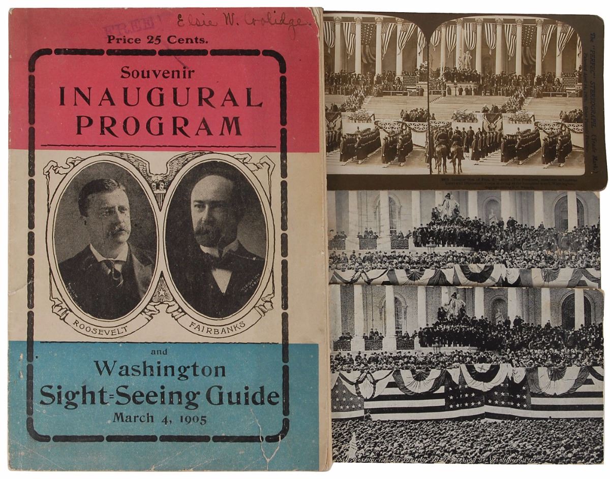 Collection of inaugural materials, including: a Roosevelt–Fairbanks souvenir inaugural program and Washington sight-seeing guide for March 4, 1905, fifty pages, 6 x 8.75, depicting President Roosevelt and Vice President Charles W. Fairbanks on the front cover; an original stereoview photo of Roosevelt’s 1905 inauguration by H. C. White; and two identical postcards depicting the crowd at Taft’s 1909 inauguration. In overall very good to fine condition.