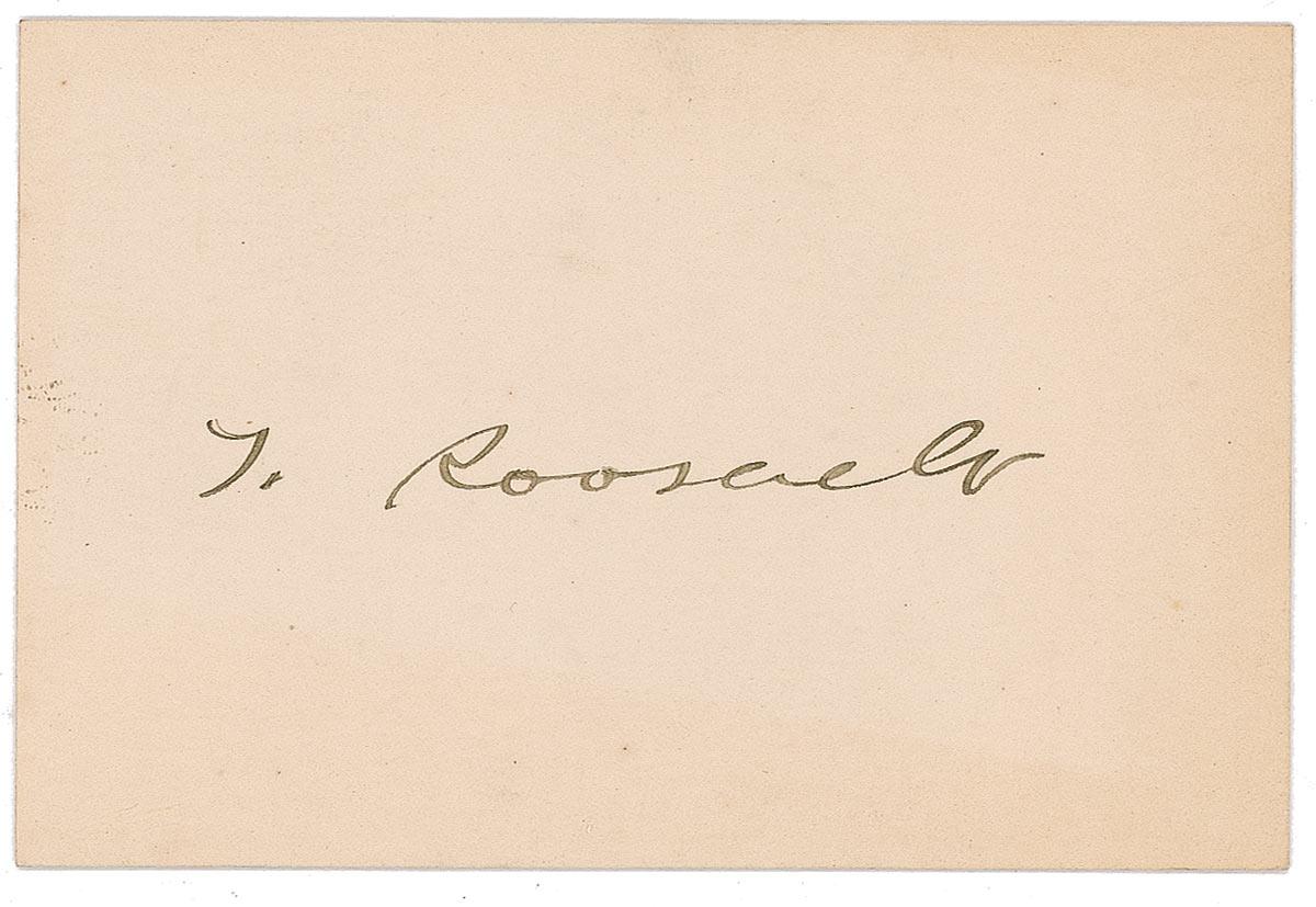 Ink signature, “T. Roosevelt,” on an off-white 3.75 x 2.5 card. In fine condition, with some mold toning to edges and small mounting remnants on reverse.