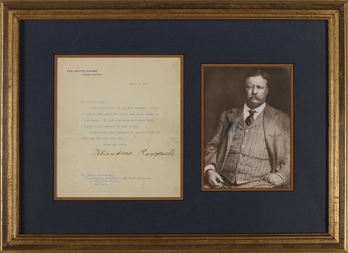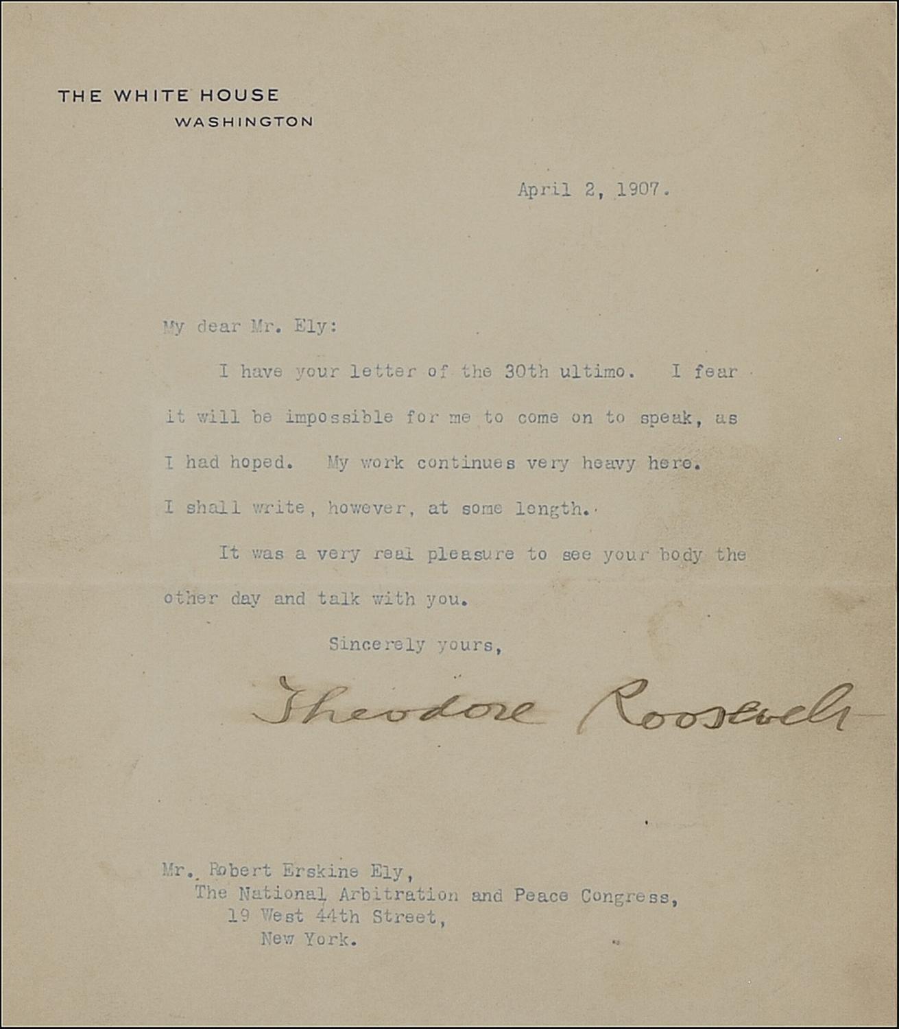 TLS as president, one page, 6.5 x 7.5, White House letterhead, April 2, 1907. Roosevelt writes Robert Erskine Ely of the National Arbitration and Peace Congress. In full: “I have your letter of the 30th ultimo. I fear it will be impossible for me to come on to speak, as I had hoped. My work continues heavy here. I shall write, however, at some length. It was a very real pleasure to see your body the other day and talk with you.” In very good condition, with mild toning, few scattered light creases, mild soiling (heavier at the right side) and haloing to the start of Roosevelt’s name. Double-matted with a Pach Bros. portrait to an overall size of 19 x 14. Bold TR signature with a rather awkwardly phrased closing sentence by the chief executive.