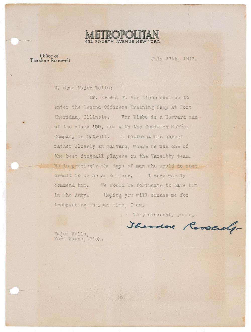 TLS, one page, 8.25 x 11, Metropolitan letterhead, July 27, 1917. Roosevelt sends a letter of recommendation to Major Wells at Fort Wayne, Michigan. In part: “Van Wiebe is a Harvard man of the class ’09, now with the Goodrich Rubber Company in Detroit. I followed his career rather closely in Harvard, where he was one of the best football players on the Varsitty [sic] team. He is precisely the type of man who would do most credit to us as an officer. I very warmly commend him. We would be fortunate to have him in the Army. Hoping you will excuse me for trespassing on your time.” In very good condition, with intersecting mailing folds, punch holes to left edge, some light creasing, and areas of mild irregular toning and staining. A boldly signed example with great association of Roosevelt, Harvard, and football.