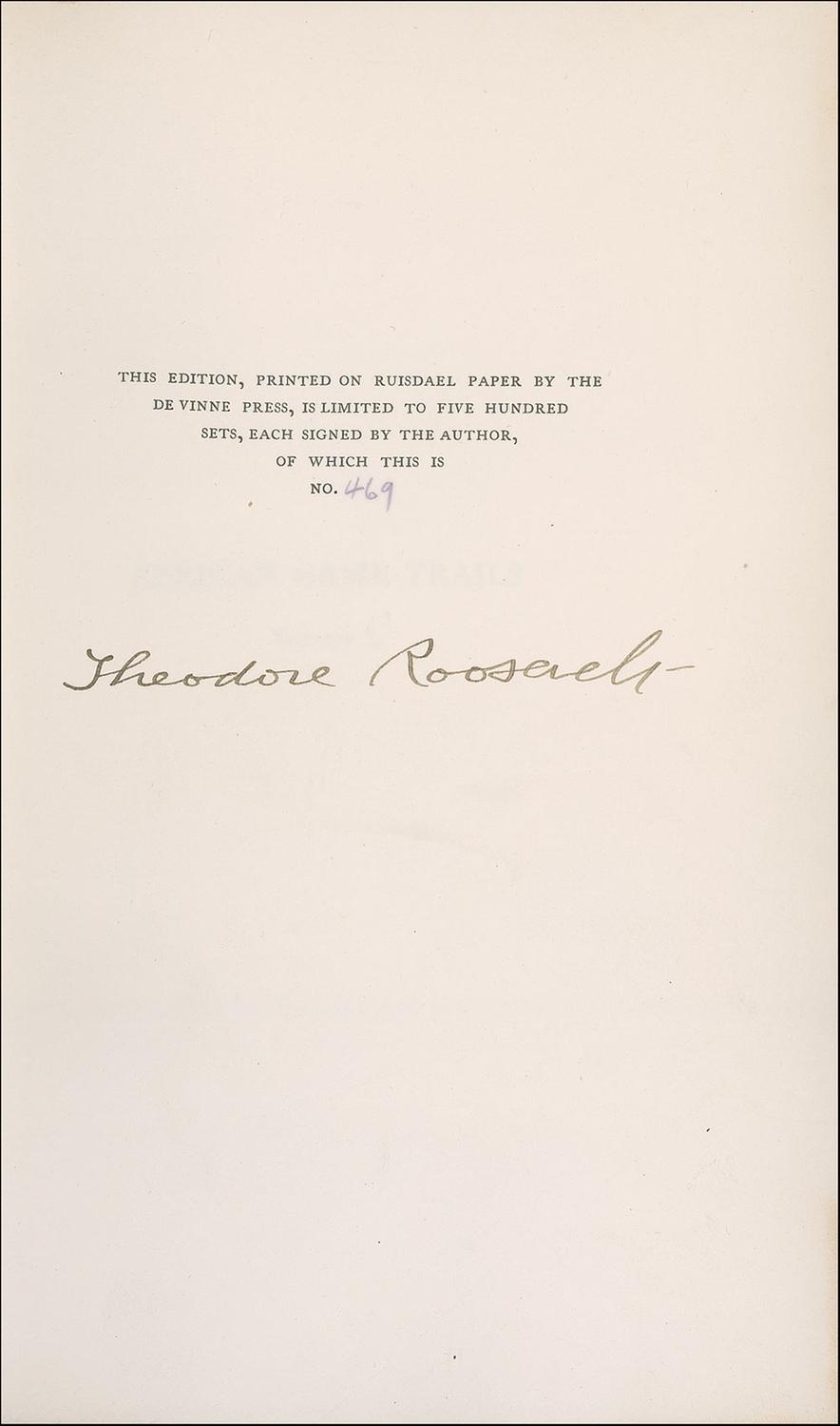 Signed book: African Game Trails Volume 1. Later printing limited edition of 500 copies (this copy No. 469). NY: Charles Scribner’s Sons, 1910. Hardcover, 6.75 x 10, 268 pages. Signed on the limitation page, “Theodore Roosevelt.” Retaining original board and spine, although it has been repaired at some point, with visible tape strip between inside front cover and first free end page, owner’s name in ink at top left corner of front board, wear and chipping to edges, mild to moderate edge toning to the first and last few pages, and moderate wear to the covers and spine, otherwise very good condition.