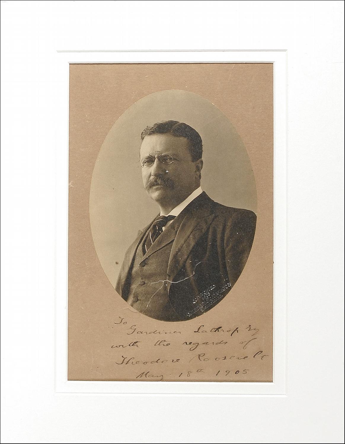 Vintage matte-finish 5.25 x 7.5 oval-shaped C. M. Bell photo affixed to its 8.5 x 12 cardboard mount, signed and inscribed on the mount in fountain pen “To Gardiner Lathrop with the regards of Theodore Roosevelt. May 18th, 1905.” Removably double matted to an overall size of 11 x 14. In very good condition, with cracking, chipping, and silvering to the image and mild soiling and missing corners to the mount. Most of the mount’s faults can be easily matted out.