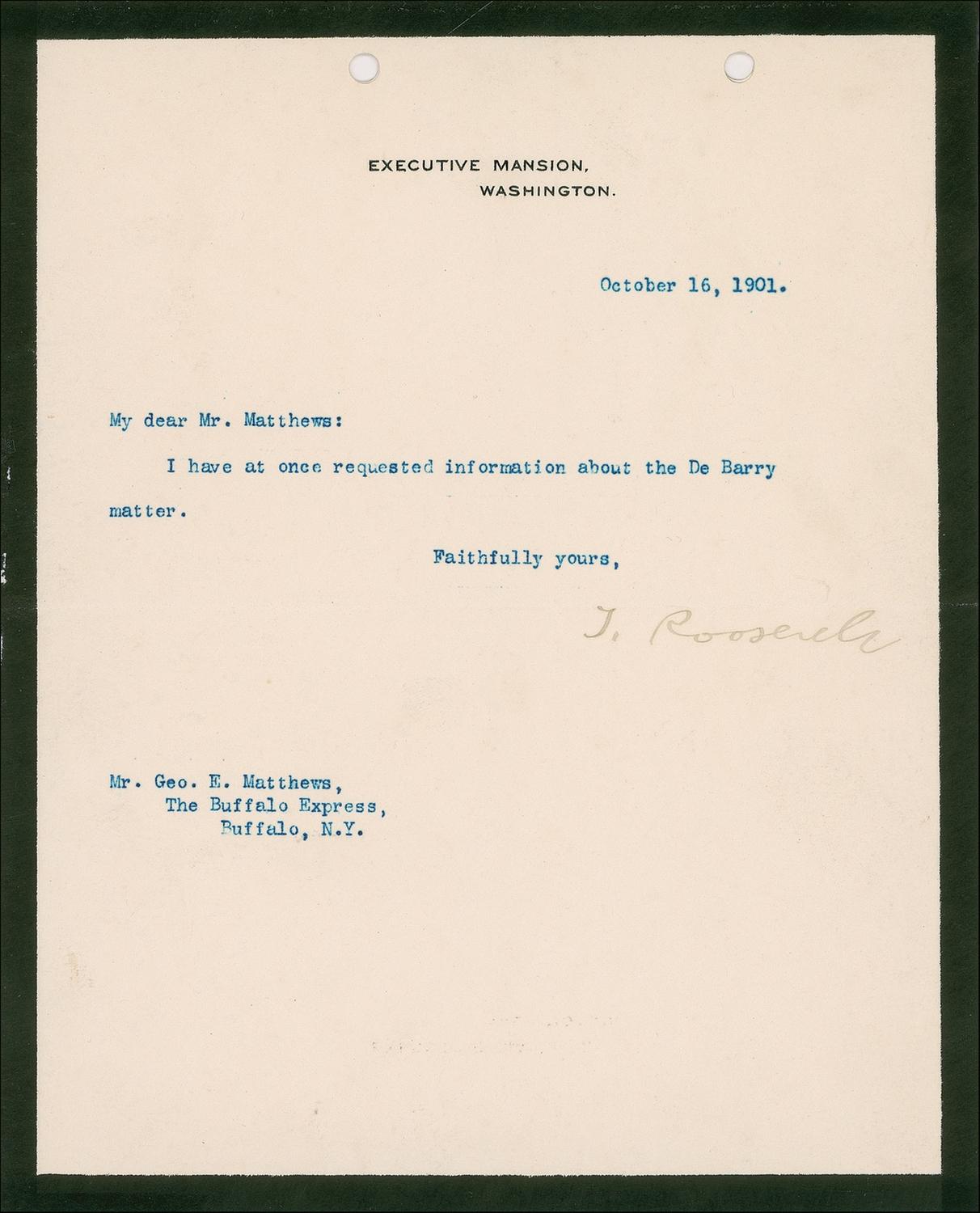 TLS as president signed “T. Roosevelt,” one page, 7.25 x 9, black-bordered Executive Mansion letterhead, October 16, 1901. Brief letter to George Matthews of the Buffalo Express. In full: “I have at once requested information about the De Barry matter.” A central horizontal fold directly above signature, Roosevelt’s signature a couple shades light, but still completely legible, mild toning, and two punch holes to top edge, otherwise fine condition.