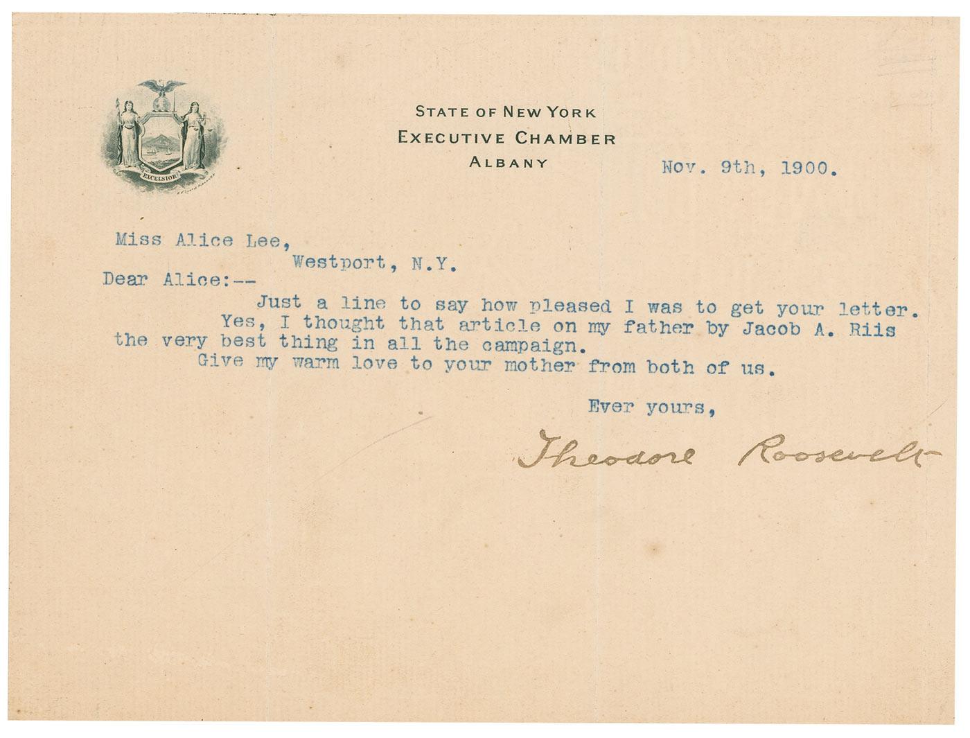TLS, one page, 8 x 6, State of New York letterhead, November 9, 1900. Letter of thanks to Alice Lee. In full: “Just a line to say how pleased I was to get your letter. Yes, I thought that the article on my father by Jacob A. Riis the very best thing in all the campaign. Give my warm love to your mother from both of us.” In fine condition, with three vertical folds, two through single letters of signature, and some mild toning and soiling.
