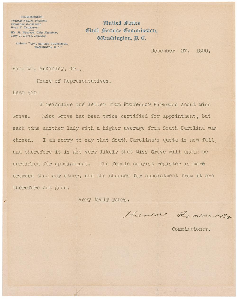 TLS, one page, 7.75 x 9.75, United States Civil Service Commission letterhead, December 27, 1890. Letter to Representative William McKinley, Jr. In full: “I reinclose [sic] the letter from Professor Kirkwood about Miss Grove. Miss Grove has been twice certified for appointment, but each time another lady with a higher average from South Carolina was chosen. I am sorry to say that South Carolina’s quota is now full, and therefore it is not very likely that Miss Grove will again be certified for appointment. The female copyist register is more crowded than any other, and the chances for appointment from it are therefore not good.” Several intersecting folds, one through a single letter of signature, a block of uniform overall toning from previous display, and a few small edge tears, otherwise fine condition.
