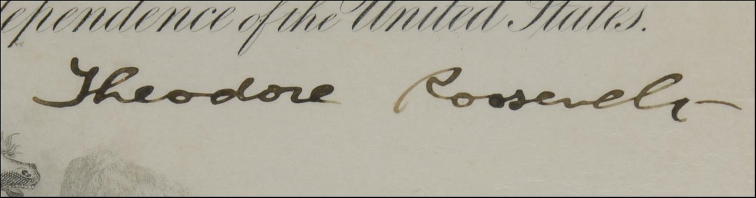 Partly-printed DS as president, one page, 15 x 20, March 22, 1902. President Roosevelt appoints Ivan C. Wettengel to the rank of “Lieutenant Junior Grade in the Navy.” Signed at the conclusion by Roosevelt, and countersigned by Secretary of the Navy James Long. Document is mounted and double matted and framed to an overall size of 22 x 28. In fine, clean condition, with some scattered light wrinkling and creasing, as well as some mild toning and foxing to upper portion of document. Wettengel received the Navy Cross for his command of the USS Wisconsin during World War I, and later served as Guam’s 25th naval governor from 1920-21, and a number of locations on Guam are named in Wettengel's honor.