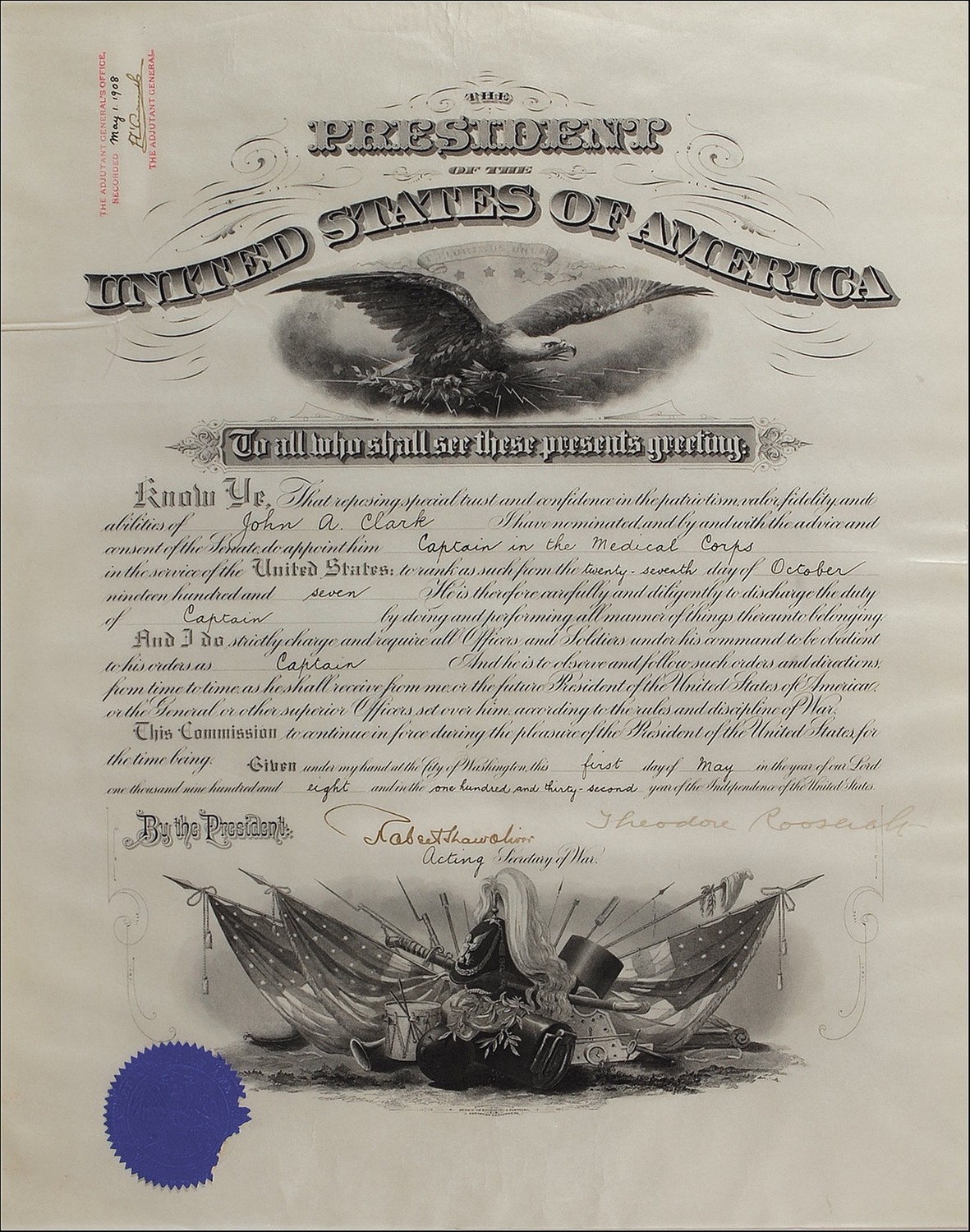 Partly-printed DS as president, one page, 15.5 x 19, May 1, 1908. Roosevelt appoints John A. Clark a “Captain in the Medical Corps.” Signed at the conclusion by Roosevelt and countersigned by the Acting Secretary of War. In fine condition, with Roosevelt’s signature just a shade or two light, a few edge dings, and a bit of mild edge toning. The blue seal is mostly intact.